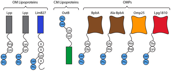 Representative membrane lipoproteins and OMPs tethered to PG (light blue) and their attachment sites (white). E. coli Lpp (grey) C-terminal Lys-Arg, D. dadantii Lpp C-terminal Lys-Lys, C. burnetii LimB27 (dark blue) Lys21, D. dadantii OutB C-terminal Lys-Lys, C. burnetii BpbA (brown) N-terminal Ala-Gly, C. burnetii BpbA N-terminal Gly-Gly, B. abortus OMP25 (orange) N-terminal Asp-Ala, L. pneumophilia Lpg1810 (red) C-terminal Lys-Thr.
