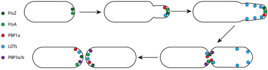 Members of the order Hyphobacteriales (Rhizobiales) are α-proteobacteria living in the soil or on plants. They are rich in YkuD family LDTs, commonly containing 5–8 homologs with up to 21 being observed [99]. Hyphobacteriales are characterised by their unipolar growth where the cell envelope is synthesised near one of the poles, forming a new small ‘chamber’ which increases in length and diameter before septal formation at the midcell initiates cell division and daughter cell separation (Figure 6) [139,140,141]. Hyphobacteriales species also utilise OMPs to anchor their OM to the PG via conserved N-terminal alanyl-aspartyl motifs (Figure 5) [23,41].