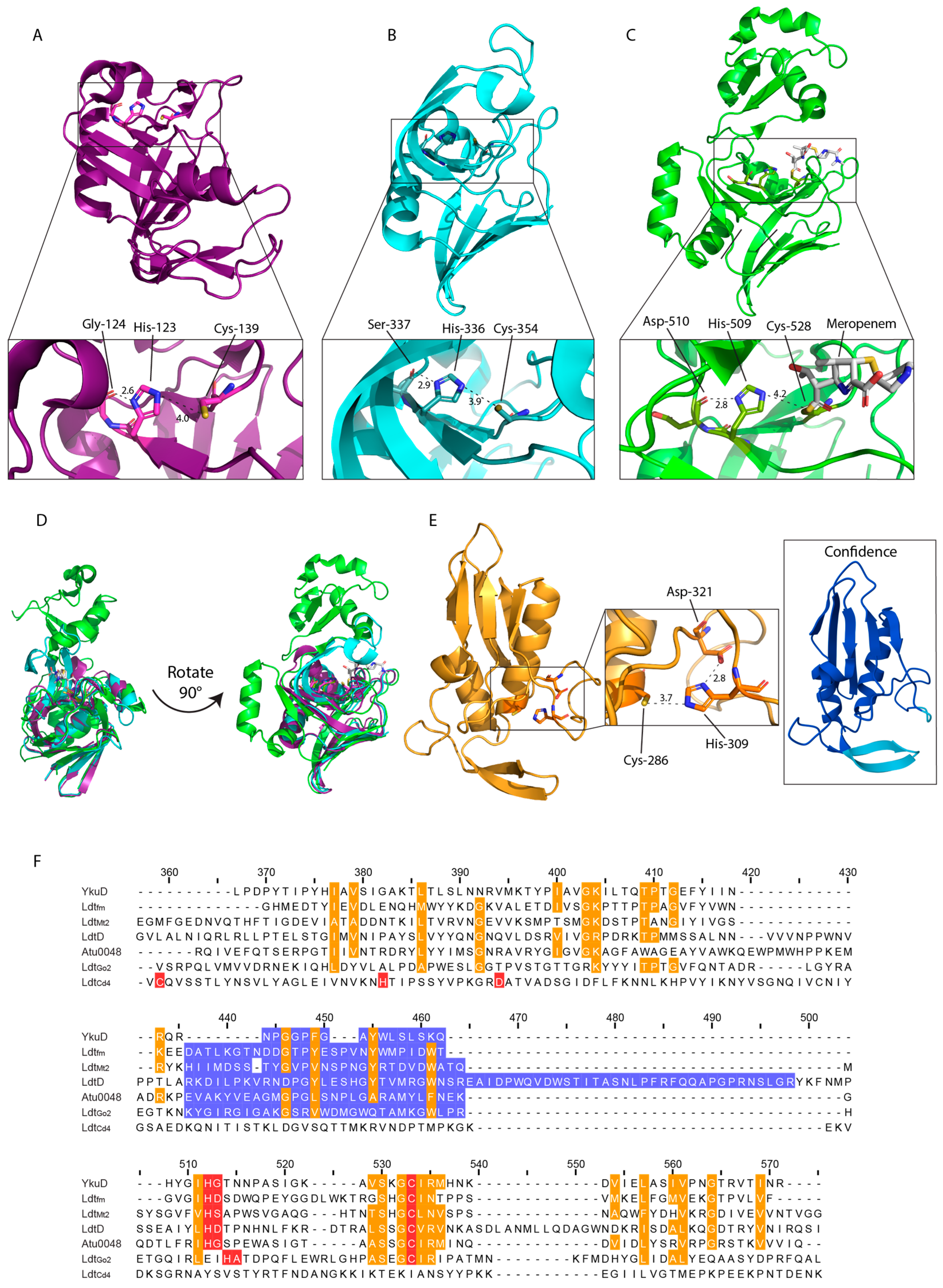 - Zandi, T.A.; Marshburn, R.L.; Stateler, P.K.; Brammer Basta, L.A. Phylogenetic and biochemical analyses of Mycobacterial L, D-transpeptidases reveal a distinct enzyme class that is preferentially acylated by meropenem. ACS Infect. Dis. 2019, 5, 2047–2054. [Google Scholar] [CrossRef] [PubMed]