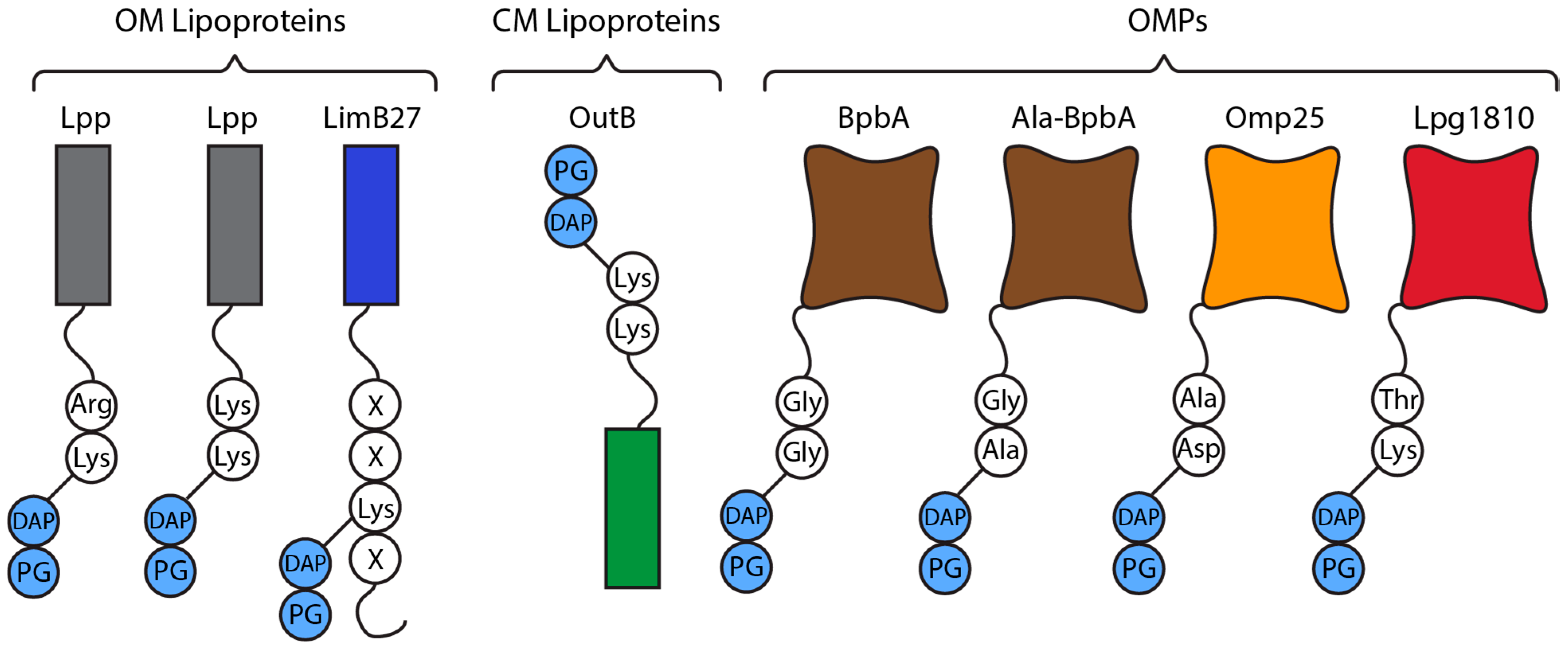 | Species | Lipoprotein 1 | TM Helix | Soluble and PG Binding Domain 2 | Soluble | Ref. |