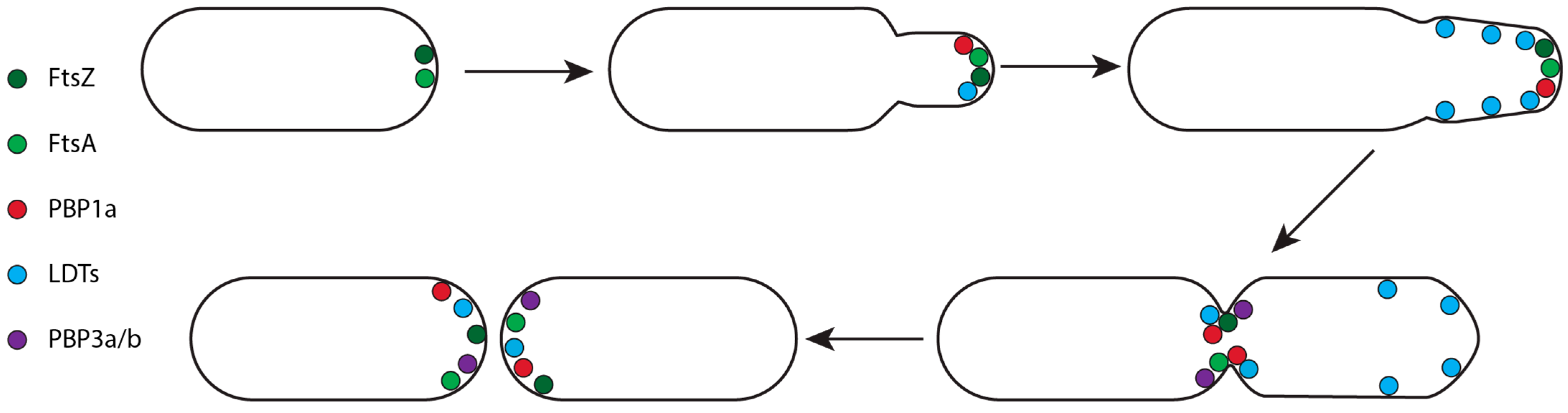 | E. coli | LdtC, LdtD, LdtE, | LdtA, LdtB, DpaA | [10,28,43,58] | ||