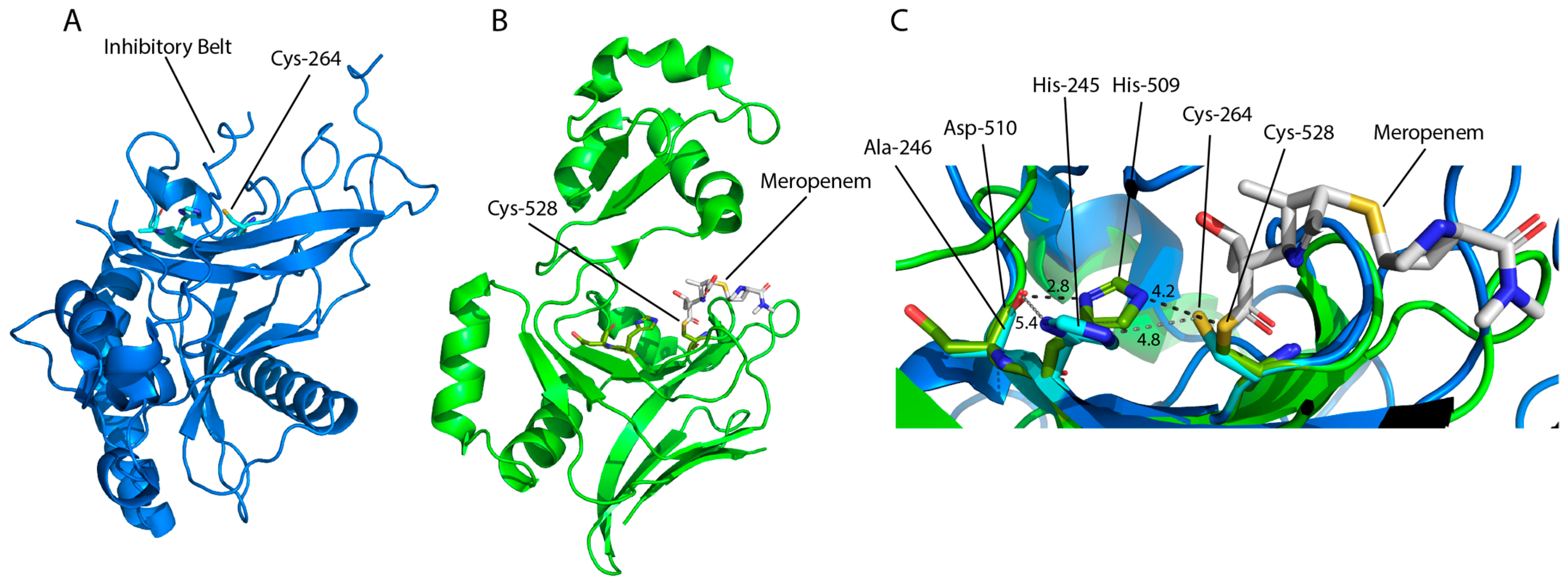 - Bianchet, M.A.; Pan, Y.H.; Basta, L.A.B.; Saavedra, H.; Lloyd, E.P.; Kumar, P.; Mattoo, R.; Townsend, C.A.; Lamichhane, G. Structural insight into the inactivation of Mycobacterium tuberculosis non-classical transpeptidase LdtMt2 by biapenem and tebipenem. BMC Biochem. 2017, 18, 8. [Google Scholar] [CrossRef]