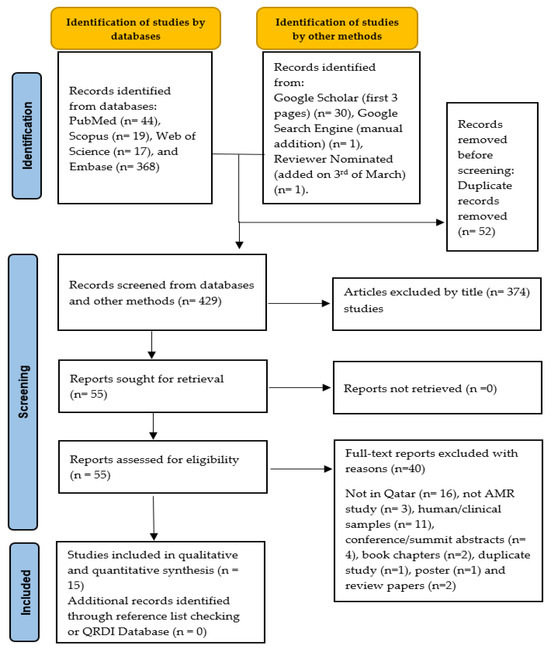 A comprehensive literature search was conducted across multiple databases, including PubMed, Scopus, Web of Science, Embase, and Google Scholar (limited to the first three pages to capture the most relevant in gray literature and local reports not indexed in major databases, to identify relevant studies on AMR in animals, food, and the environment in Qatar. The search was performed on 18–19 February 2025, with no restrictions on publication dates to ensure comprehensive coverage of all relevant literature. The search was tailored to each database using Boolean operators (AND, OR), and the following search terms were used: “antimicrobial resistance, AMR, antibiotic resistance, animals, livestock, poultry, cattle, food, dairy, meat, environment, wastewater, sea, soil, water, air, Qatar, Doha. The following search terms were executed via the Boolean operator NOT: “Saudi Arabia, UAE, Kuwait, Bahrain, Oman, Iran, Middle East”. Furthermore, a search of the Qatar Research, Development, and Innovation (QRDI) database on the Qatar National Research Fund (QNRF) website was conducted to identify any potentially relevant studies that may have been funded, published as preprints, or not yet released. This confirmed that all relevant studies had already been captured through the primary database search. Moreover, an article published in March 2025, after the search, was identified and manually added. Finally, the reference lists of the included studies were also manually screened for any additional eligible articles. Detailed database search strategies are provided in Supplementary Section S1.