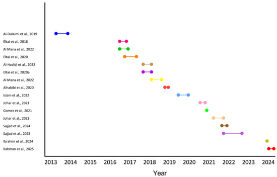 Among the included studies [14,15,16,17,18,19,20,21,22,23,24,25,26,27,28] (Table 1), 40% (n = 6) investigated AMR in food sources with a strong emphasis on poultry products [14,15,16,17,18,19]. Meanwhile, studies focused on live animals were 33.3% (n = 5) [14,21,22,23,24], and the environmental studies were 26.7% (n = 4) [25,26,27,28]. All included studies were cross-sectional in design, with sample sizes ranging from a minimum of 12 to a maximum of 300 [22,28]. The sampling periods across the included studies spanned over a decade, reflecting a wide temporal range in AMR surveillance. Most studies collected samples between 2013 and 2024, with a noticeable concentration during the years 2016 to 2022. The earliest sampling occurred from July 2013 to February 2014, while the most recent was between February and May 2024 (Figure 2 and Table 1).