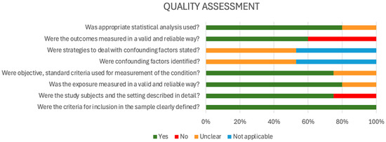 - Moola, S.; Munn, Z.; Tufanaru, C.; Aromataris, E.; Sears, K.; Sfetcu, R.; Currie, M.; Lisy, K.; Qureshi, R.; Mattis, P.; et al. Chapter 7: Systematic Reviews of Etiology and Risk. In Critical Appraisal Checklist for Analytical Cross Sectional Studies; The Joanna Briggs Institute: Adelaide, Australia, 2017. [Google Scholar]