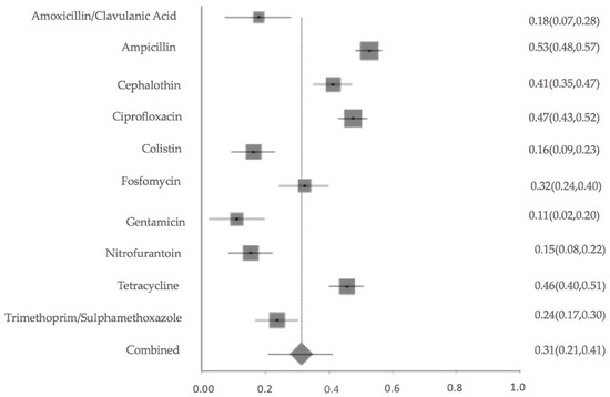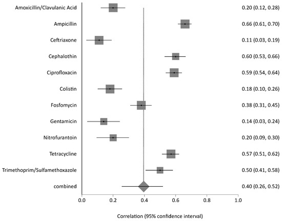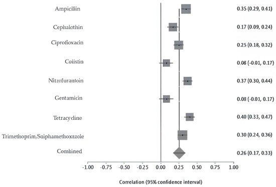 Forest plot of pooled resistance rates for Escherichia coli isolates across studies with 95% confidence intervals. The X-axis shows the correlation coefficient (r); the Y-axis shows the antibiotic studied. The squares represent the resistance rate for each study, with horizontal lines depicting the 95% confidence intervals. The diamond represents the overall pooled resistance rate.