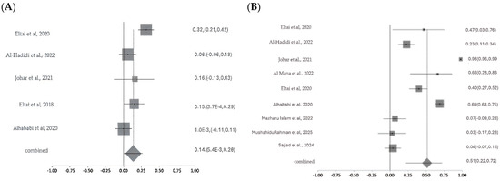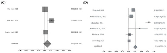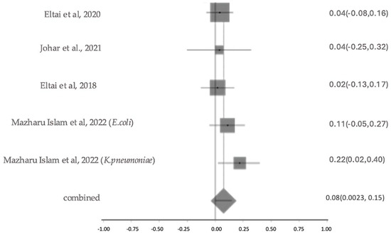 The prevalence of ESBL-producing organisms varied considerably across the studies. Eltai et al. (2020) [14] reported a confirmed ESBL rate of 4.2%, while Johar et al. (2021) [16] found a 3.8% confirmed rate in diseased animal isolates. Islam et al. (2022) [23] reported ESBL production in 11.86% of E. coli and 22.2% of K. pneumoniae isolates, yielding an overall confirmed ESBL rate of 13.2%. Low confirmed prevalence (2.2%) was noted in a study by Eltai et al. (2018) [20]. Al-Hadidi et al. (2022) [15] described a presumptive rate of 26.7%, based on molecular screening. Gomez et al. (2021) [18] detected blaTEM (5%) and blaSHV (57%), while Rahman et al. (2025) [24] reported blaCTX-M, and Johar et al. (2023) [28] identified blaVEB, blaGES, and blaOXA variants. However, without phenotypic AST, these findings remain presumptive. The meta-analysis estimated the overall prevalence of ESBL resistance to be 8% (as shown in Figure 10), with no significant heterogeneity among studies (Cochran’s Q = 3.15, p = 0.53; I2 = 0%), indicating consistent resistance levels across different study settings. The investigations on ESBL prevalence were moderately sized and showed overall moderate study quality, with some results being presumptive due to reliance on molecular detection. Sensitivity analysis for ESBL resistance showed that heterogeneity remained low, with I2 values ranging from 12% to 30% when individual studies were sequentially excluded. Cochran’s Q value also changed minimally, indicating stable model performance. This suggests the robustness of the results.