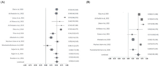 Study quality and risk of bias were assessed by one reviewer using the Joanna Briggs Institute (JBI) Critical Appraisal Checklist for Prevalence Studies. No automation tools were used. The certainty of evidence was assessed based on study quality, consistency, and heterogeneity, acknowledging limitations from small study numbers and methodological variability. Sensitivity analysis was performed using the leave-one-out approach, in which the meta-analysis was repeated by sequentially removing one study at a time to evaluate the influence of individual studies (StatsDirect Statistical Analysis Software, version 4.0.4, Altrincham, UK). Changes in the pooled estimates, heterogeneity (I2), and Cochran’s Q values were examined to assess the robustness of the results.