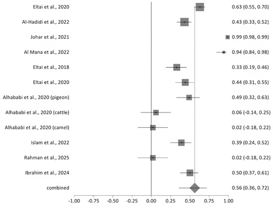 Bacterial isolates from livestock, poultry, and wild animals were reported in 5 studies and exhibited high resistance to several antibiotics. Chickens showed the highest resistance, with ampicillin at 72%, trimethoprim/sulfamethoxazole at 63%, and ciprofloxacin at 40%. Rodents and pigeons also demonstrated elevated resistance, particularly to tetracycline at 67% and 64%, respectively; ampicillin at 56% and 55%; and trimethoprim-sulfamethoxazole at 35% and 49%. Rodents additionally showed high resistance to nitrofurantoin at 61%. Sheep isolates exhibited high resistance to ciprofloxacin (69%), nitrofurantoin (47%), trimethoprim-sulfamethoxazole (46%), and cephalothin (43%). In contrast, isolates from camels, cattle, and oryx exhibited relatively low resistance levels across all antibiotics tested (Figure S1). The pooled analysis of AMR in animal-derived samples revealed significant heterogeneity (Q = 70.10, df = 7, p < 0.0001). The estimated between-study variance was 0.01391, with an I2 value of 90% (95% CI: 82.9–93.3%), indicating high inconsistency among the included studies. (Figure 5). The overall resistance across animals’ AMR category was estimated at 26% (95% CI: 0.17–0.33). The contributing animal studies were small to moderate in size, with low-to-moderate risk of bias. The sensitivity of pooled AMR rates from animal-derived bacterial isolates was stable. The I2 and Cochran’s Q statistics remained consistent, confirming the robustness and reliability of the prevalence.