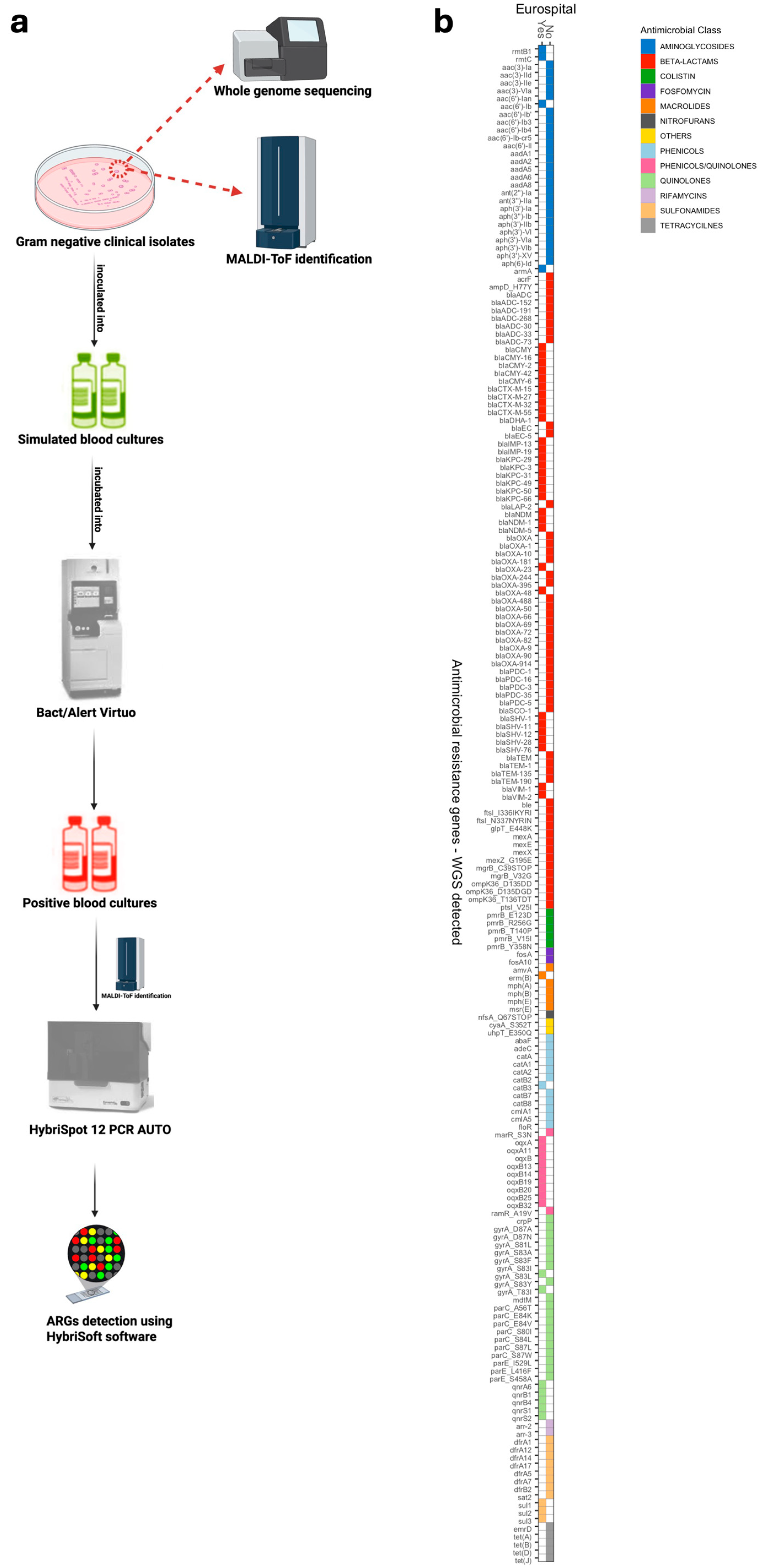 - Ivagnes, V.; De Maio, F.; Baccani, I.; Antonelli, A.; Menchinelli, G.; Rosato, R.; Cafaro, G.; Santarelli, G.; Falletta, F.; D’Inzeo, T.; et al. Detection of β-lactam resistance genes in Gram-negative bacteria from positive blood cultures using a microchip-based molecular assay. Front. Cell. Infect. Microbiol. 2025, 15, 1597700. [Google Scholar] [CrossRef] [PubMed]
