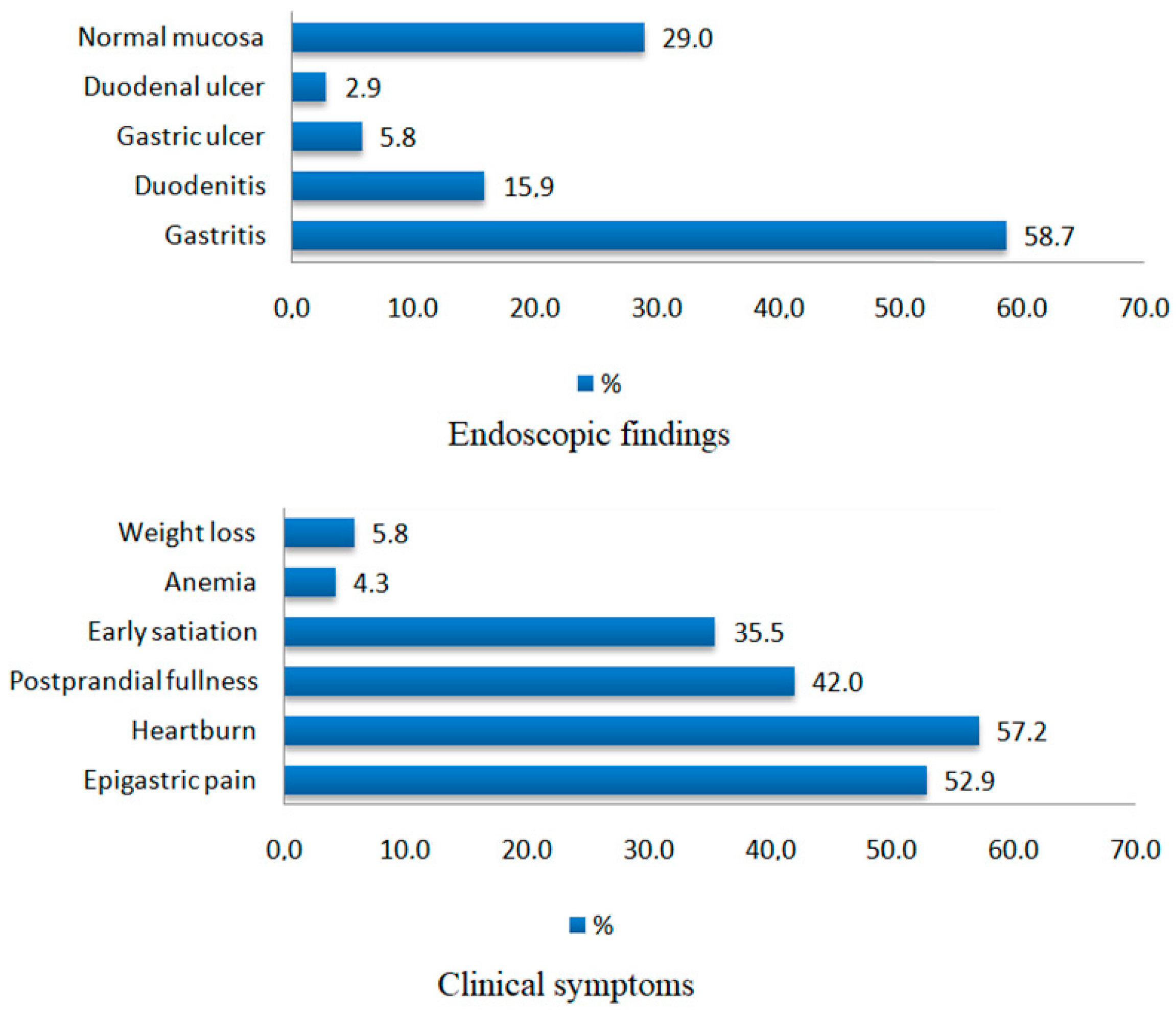 - Tacikowski, T.; Bawa, S.; Gajewska, D.; Myszkowska-Ryciak, J.; Bujko, J.; Rydzewska, G. Current Prevalence of Helicobacter pylori Infection in Patients with Dyspepsia Treated in Warsaw, Poland. Prz. Gastroenterol. 2017, 12, 135–139. [Google Scholar] [CrossRef] [PubMed]
