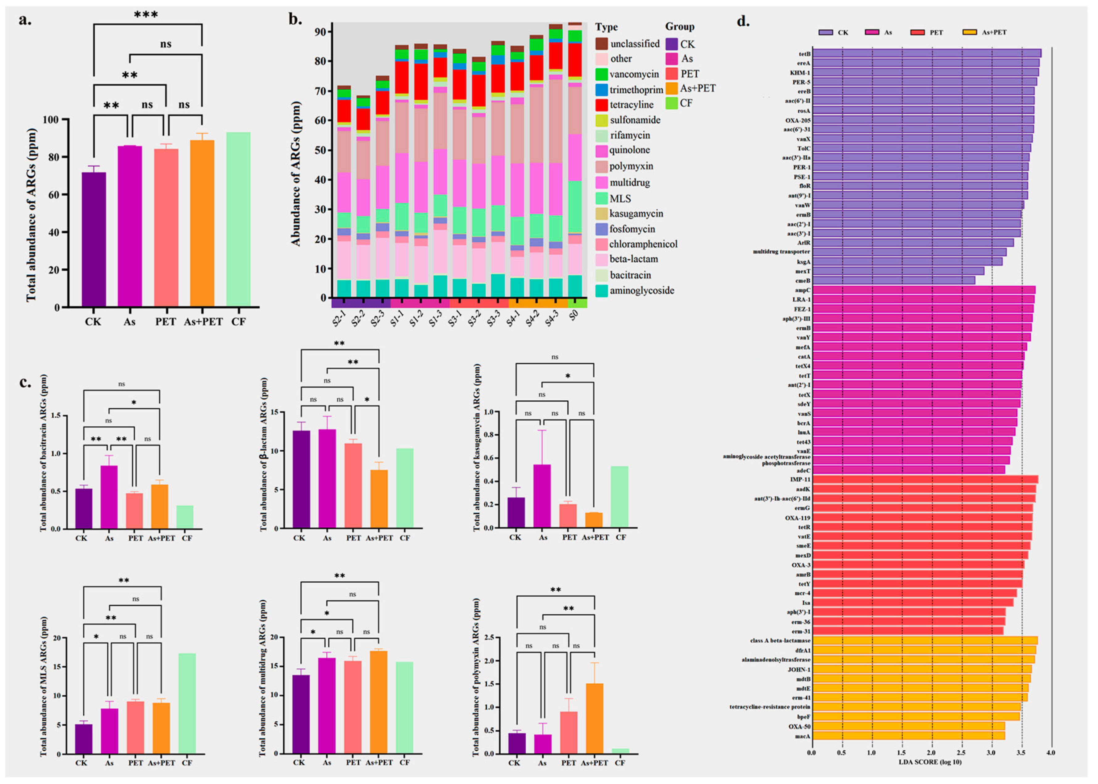 At the gene-specific level, the As treatment group exhibited significant enrichment of 21 plasmid-associated ARGs, including blaampC, blaLRA-1, blaFEZ-1, aph(3′)-II, ermB, vanY, mefA, catA, and tetX4 (Figure 2d). The PET treatment group displayed enrichment of 17 plasmid-associated ARGs, with representative genes such as blaIMP-11, aadK, ant(3′)-Ih-aac(6′)-Id, ermG, blaOXA-119, tetR, vatE, smeE, mexD, blaOXA-3, amrB, and tetY (Figure 2d). In the combined PET and As treatment group, 11 plasmid-associated ARGs were significantly enriched, including class A beta-lactamase, dfrA1, alanine adenosyltransferase JOHN-1, mdtB, mdtE, and erm-41 (Figure 2d).
