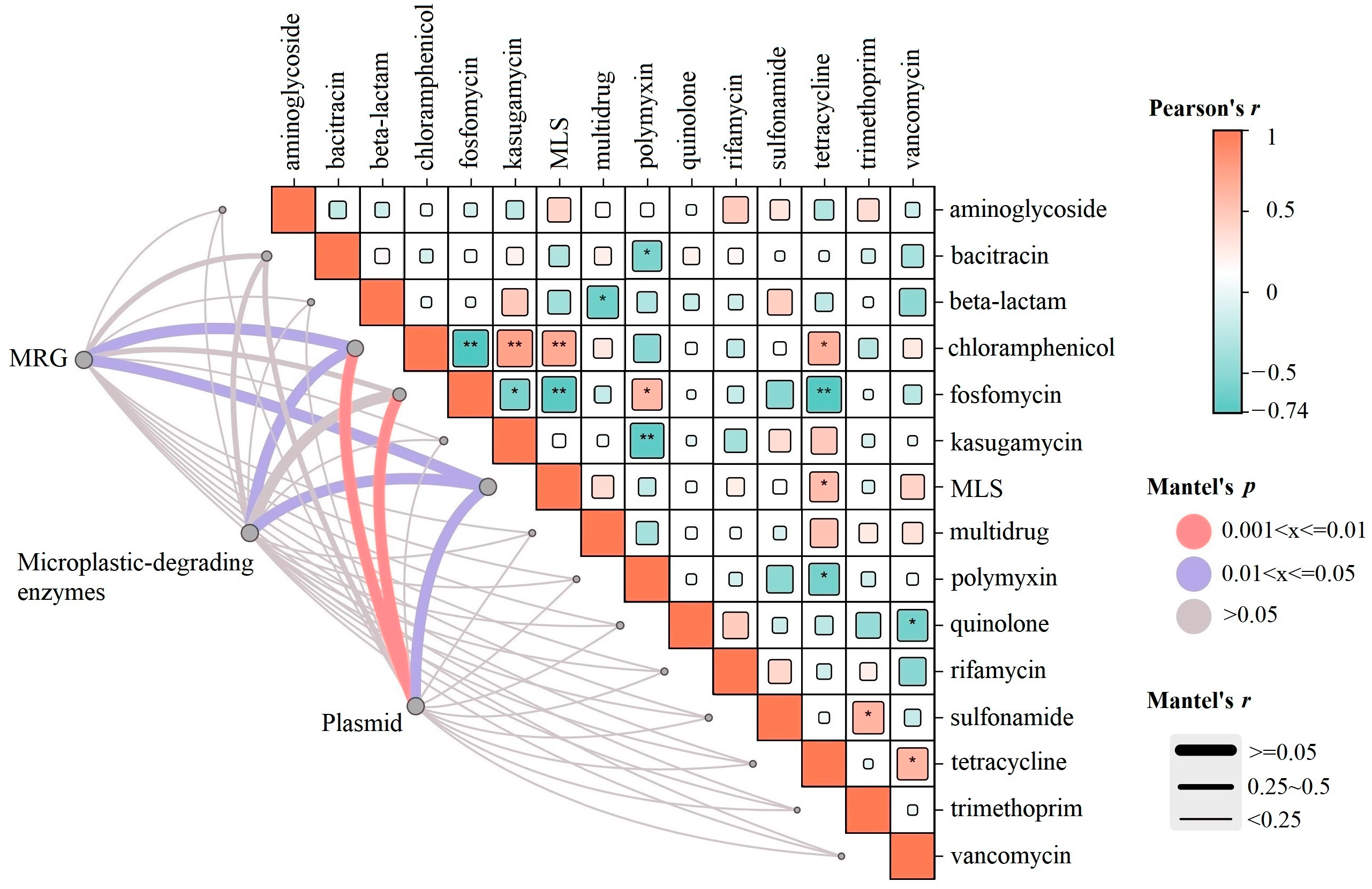 Mantel tests were performed to assess the correlations between ARG profiles and the community profiles of MRGs, microplastic-degrading genes, and plasmid abundance. The results revealed distinct drivers for different ARG categories. MRGs and microplastic-degrading genes were significantly correlated with MLS (p < 0.05) and chloramphenicol (p < 0.05) resistance genes. In contrast, plasmid abundance exhibited the strongest overall association with the ARG profiles, showing significant correlations with MLS (p < 0.05), chloramphenicol (p < 0.01), and fosfomycin (p < 0.01) resistance genes (Figure 3).
