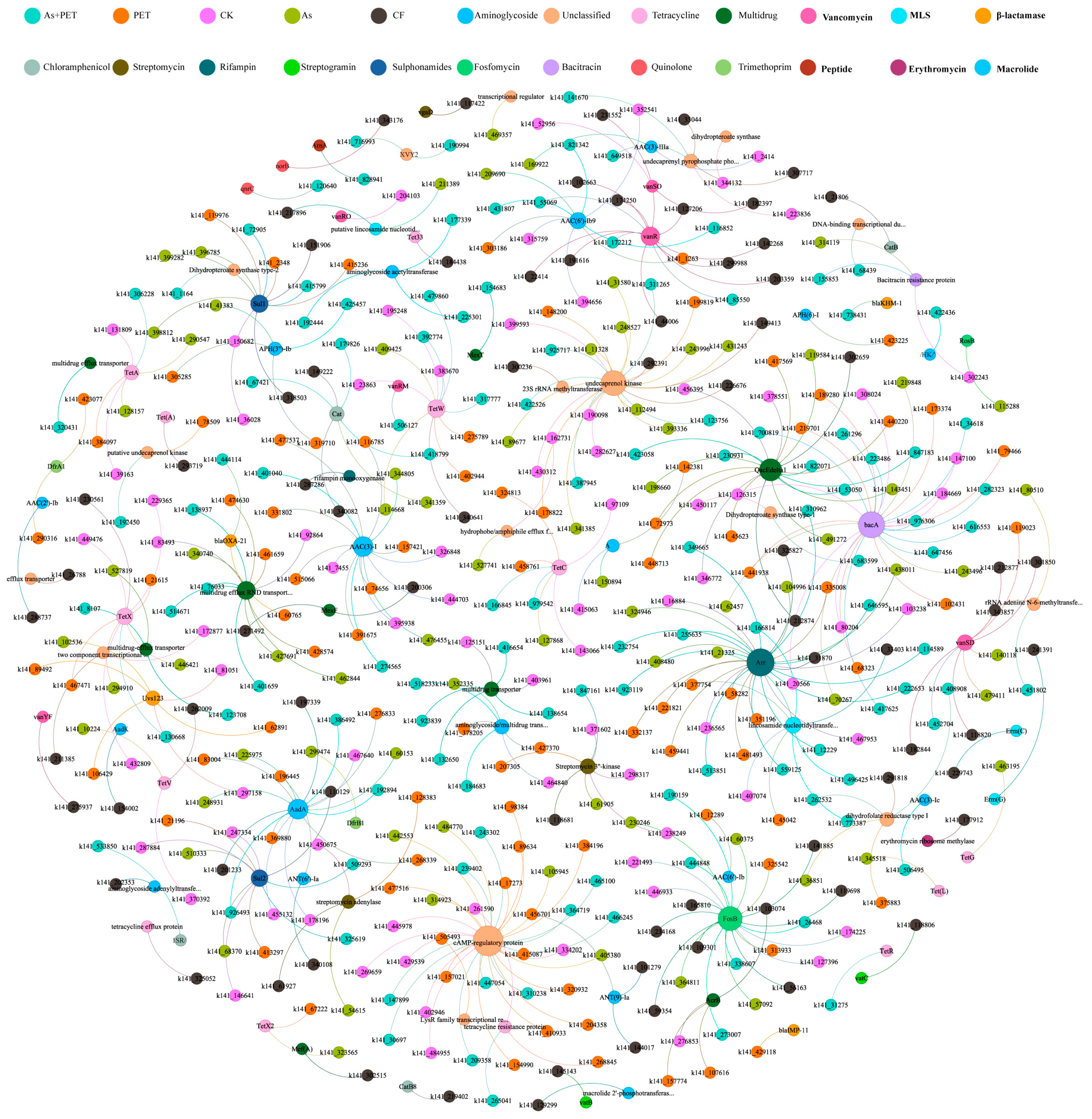 The most prevalent plasmid-carried ARGs (degree ≥ 10) included the aminoglycoside resistance genes AAC(3)-I (degree = 15), aac(6′)-Ib9 (degree = 9), and AadA (degree = 15); the rifamycin resistance gene Arr (degree = 28); the peptide resistance gene bacA (degree = 26); the phosphonic acid resistance gene fosB (degree = 22); the disinfectant resistance gene QacEdelta1 (degree = 19); the glycopeptide resistance gene vanR (degree = 13); the tetracycline resistance gene tet(W) (degree = 11); and the sulfonamide resistance genes sul1 and sul2 (degrees = 11 and 10, respectively). Additionally, several enzymes associated with broad-spectrum drug resistance, including cAMP-regulatory protein (degree = 32), were widely prevalent in plasmid genomes.
