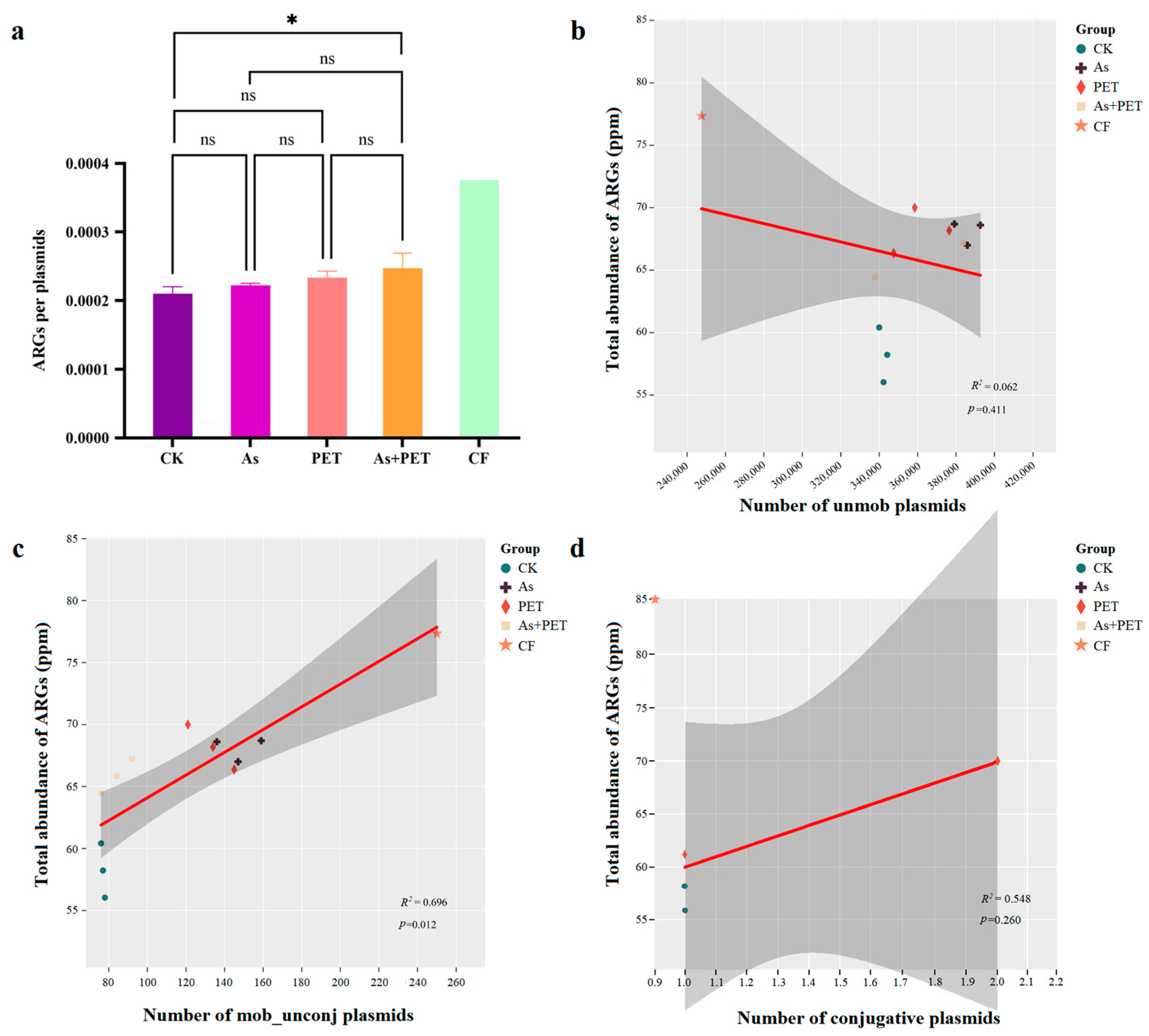 Figure 1. Abundance of plasmids among different groups. (a) Total abundance of plasmids among groups (n = 3). (bd) Abundance of non-mobilizable plasmids, mobilizable plasmids, and conjugative plasmids (n = 3). CK represents the control group (only added earthworms without pollution exposure). As represents the Arsenium treatment (arsenium exposure after earthworms are added). PET represents the polyethylene terephthalate treatment (PET microplastic exposure after earthworms are added). AS + PET represents the arsenium and PET combined treatment (AS + PET exposure after earthworms are add), and CF represents the untreated group (original fecal matter without any added substances and treatments).*Symbols indicate statistical significance: * p < 0.05, *** p < 0.001, **** p < 0.0001, ns represent not significant.