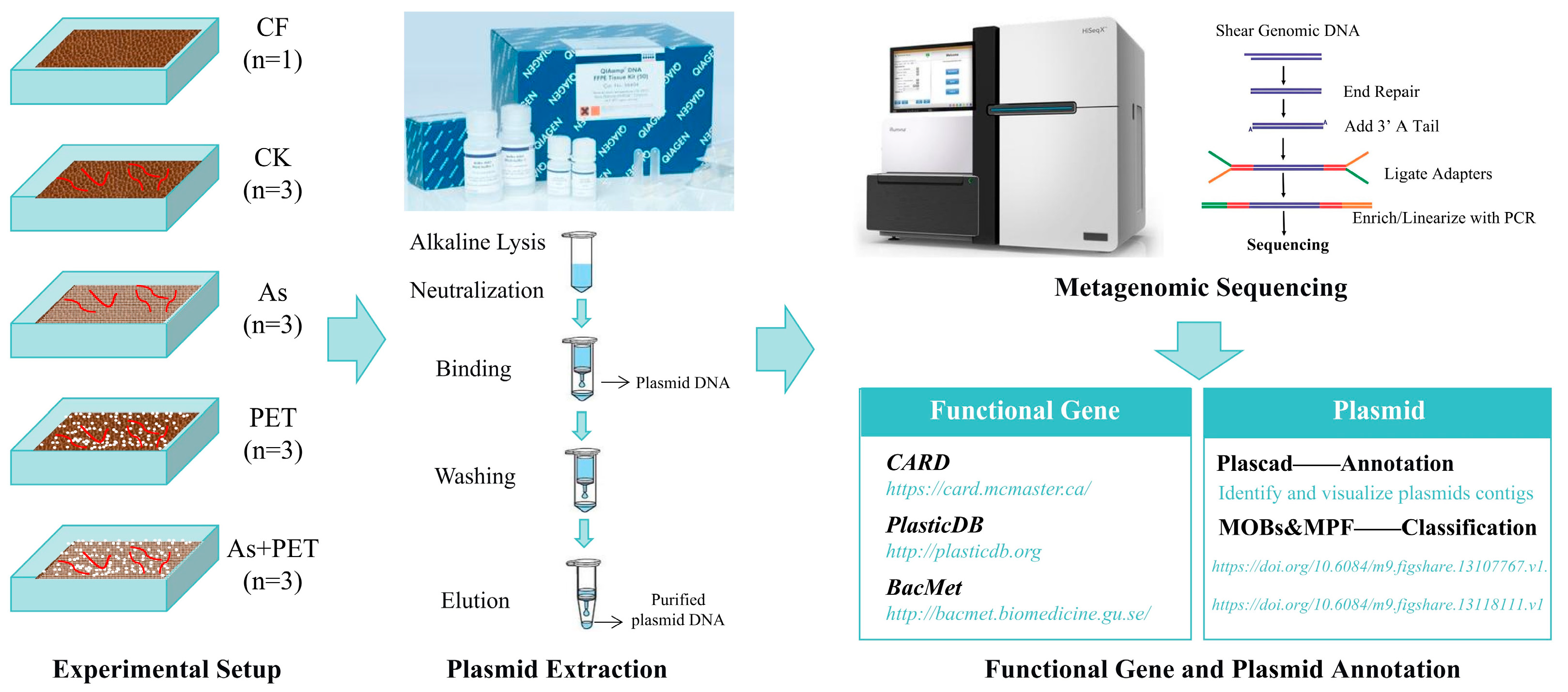 Plasmid DNA was extracted from manure samples collected from all experimental groups using the QIAGEN Plasmid Midi Kit (QIAGEN, Hilden, Germany) according to the manufacturer’s instructions. Three biological replicates were analyzed for each treatment group (CK, As, PET, and As+PET), while a single replicate was processed for the untreated control (CF) group. The obtained plasmid DNA samples were resuspended in DNase-/RNase-free ultrapure water, and their concentrations were quantified using a Qubit 2.0 Fluorometer (Life Technologies, Carlsbad, CA, USA). All DNA extracts were stored at −20 °C prior to subsequent analyses.