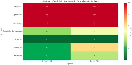 High rates of antibiotic resistance were observed among the 147 C. jejuni and 140 C. coli isolates (Table 1, Figure 1). All isolates were resistant to tetracycline, ciprofloxacin, and erythromycin. Resistance to amoxicillin–clavulanic acid was detected in 47.14% of C. coli and 31.19% of C. jejuni isolates.
