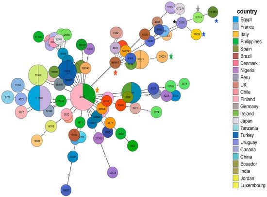 All isolates belonged to the same sequence type, ST13450, which represents a newly identified ST. The eleven selected isolates reflect the different profiles of our multidrug-resistant C. coli isolates and were compared with other international multidrug-resistant strains, first according to the country of origin and then according to the type of disease, as shown in Figure 4. Each node represents a sequence type (ST), with node size proportional to the number of isolates. Colors indicate the country of origin.