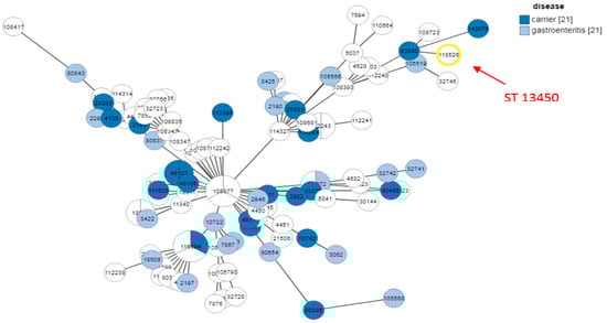 The disease-based MLST analysis in Figure 5 reveals that ST13450 isolates are found in both gastroenteritis cases and asymptomatic carriers. This dual distribution suggests that the clone has a pathogenic potential capable of causing clinical disease, while also persisting in a carrier state, which may facilitate its silent spread in human populations. Furthermore, the detection of related isolates in both animal sources (particularly chicken and chicken meat) and human samples supports the hypothesis of a zoonotic transmission cycle between animals and humans. These findings highlight the emerging and versatile nature of ST13450, demonstrating its ability to adapt to different hosts and clinical contexts. Therefore, this sequence type should be considered a potential zoonotic pathogen of public health concern.