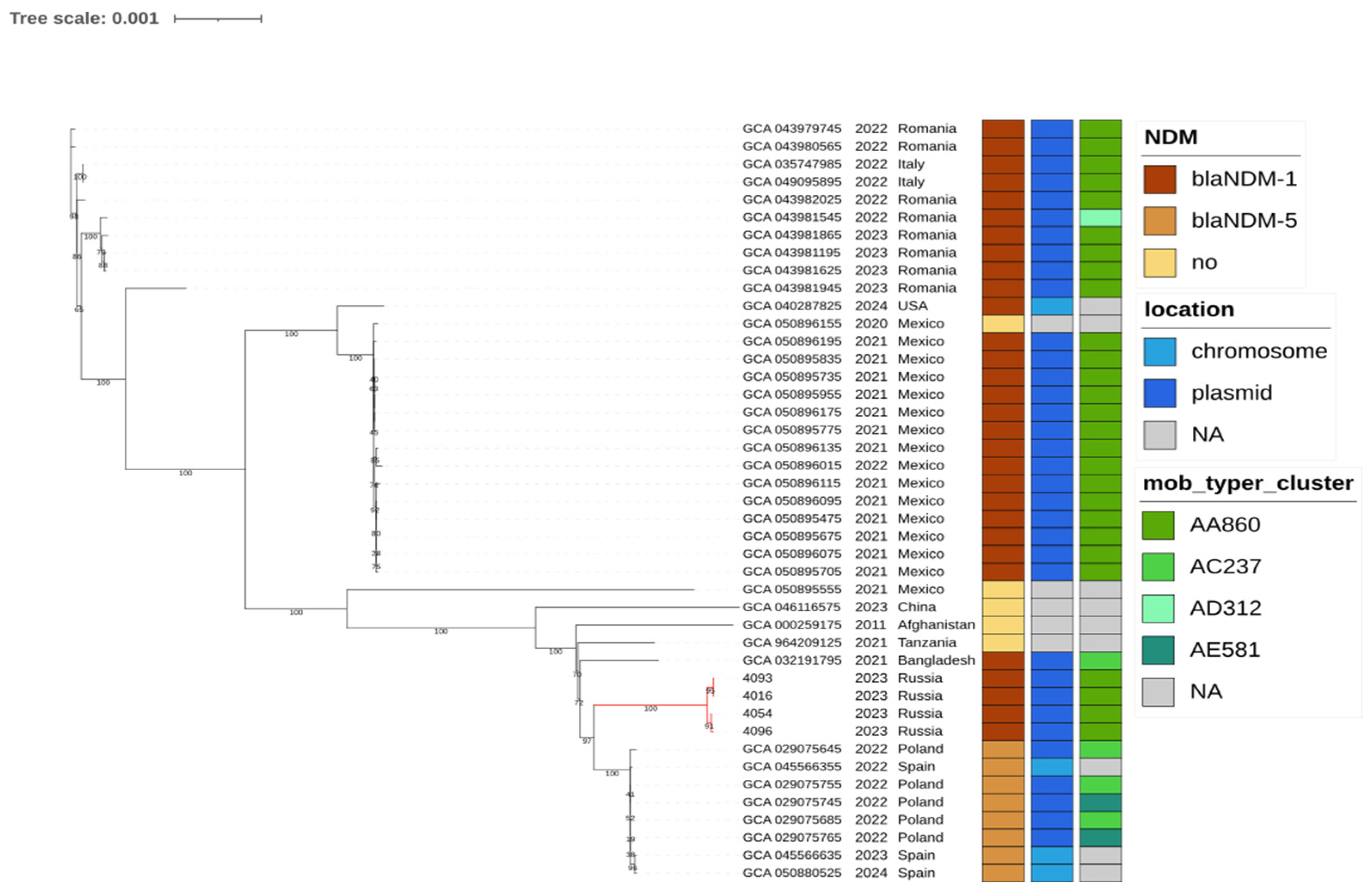 - European Centre for Disease Prevention and Control. Rapid Investigation of New Delhi Metallo-Beta-Lactamase (NDM)-1-Producing Providencia stuartii in Hospitals in Romania: November 2024; Publications Office: Luxembourg, 2024. [Google Scholar]