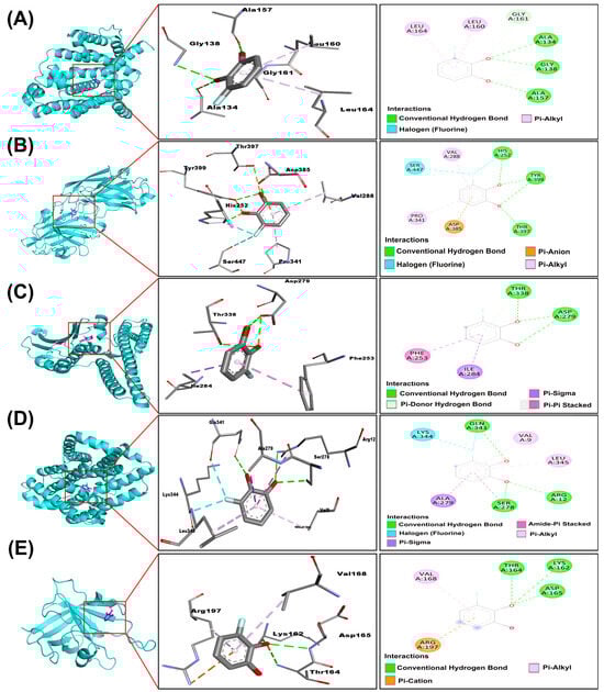 Predicted 3D and 2D interaction diagrams of 3-FC docked into active sites of S. aureus virulence proteins: (A) 2zcs, (B) 1n67, (C) Q2FIT5, (D) Q9RQP6, and (E) 2kid. Each part shows the overall protein–ligand complex structure (left), an enlarged view of the protein–ligand pocket (middle), and the 2D interaction diagram (right). Key interaction amino acid residues are labelled around the ligand. Different bonding types are indicated by distinct colors.