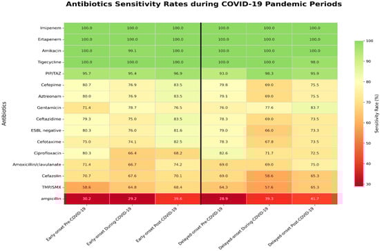 When comparing antibiotic susceptibility across the pre-, during-, and post-COVID-19 periods, amoxicillin/clavulanate susceptibility significantly decreased during the COVID-19 period (p = 0.021). Aztreonam and ciprofloxacin, which are less commonly used in pediatric patients, also showed a significant decrease in susceptibility (p < 0.001 and p = 0.003, respectively). Ciprofloxacin susceptibility decreased during the COVID-19 period, but modestly increased in the post-COVID-19 period (Table 3). In the early-onset group, ciprofloxacin susceptibility declined from 80.3% in the pre-COVID-19 period to 66.4% during the pandemic, with only partial recovery to 68.2% post-COVID-19 (p = 0.026). In contrast, the delayed-onset group showed no significant changes in antibiotic susceptibility (Figure 1).