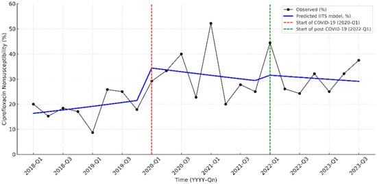 Figure 2. Interrupted time-series analysis of ciprofloxacin nonsusceptibility in pediatric UTI pathogens from 2018 to 2023. The solid black line indicates the observed nonsusceptibility, while the blue line represents the predicted trend by the interrupted time-series (ITS) model. The red dashed line marks the start of the COVID-19 pandemic period (2020-Q1), and the green dashed line indicates the beginning of the post-COVID-19 period (2022-Q1).