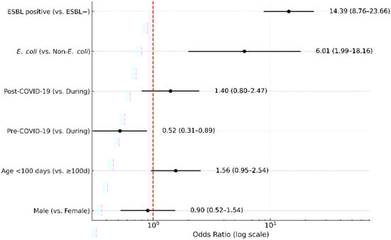 Figure 3. Multivariable logistic regression for predictors of ciprofloxacin nonsusceptibility. Adjusted odds ratios (ORs) with 95% confidence intervals (CIs) are shown for extended-spectrum β-lactamase (ESBL) production, bacterial species (E. coli vs. non-E. coli), COVID-19 period (pre vs. during, post vs. during), age (<100 days vs. ≥100 days), and sex (male vs. female). The red dashed vertical line represents the null value (OR = 1).