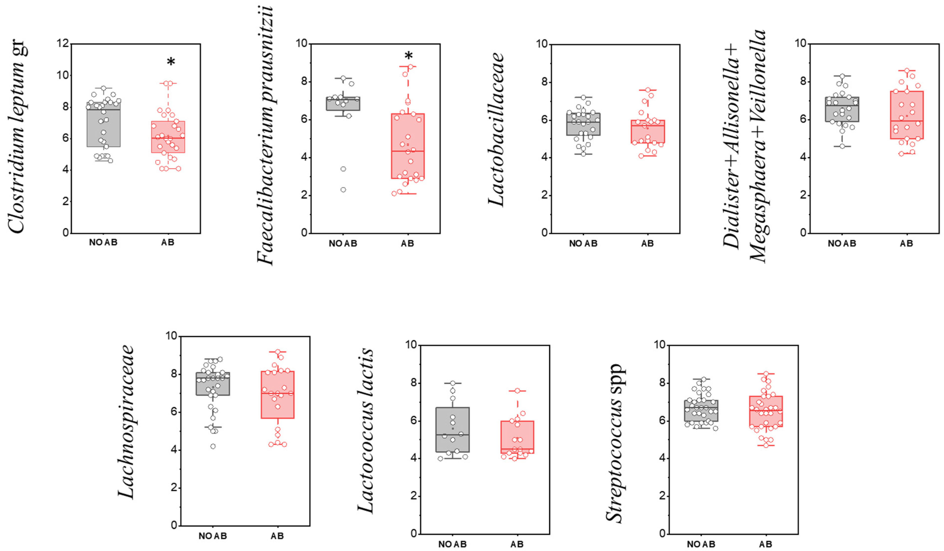 | F. prausnitzii AB | 3 | 10 | 9 | 30 | p = 0.053 |
