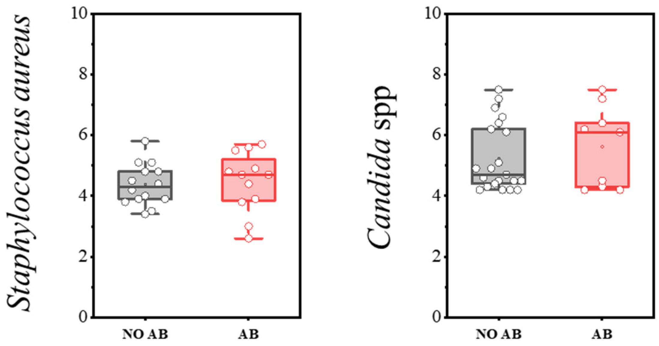 | Microorganisms | NO AB (n = 30) | Frequency (%) | AB (n = 30) | Frequency (%) | Chi-Square (χ2) |