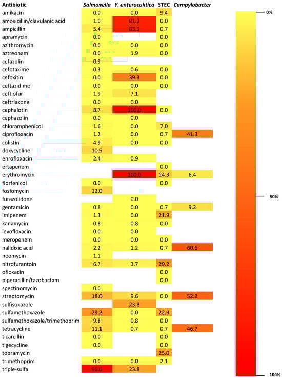 - De Jong, A.; Thomas, V.; Simjee, S.; Godinho, K.; Schiessl, B.; Klein, U.; Butty, P.; Vallé, M.; Marion, H.; Shryock, T.R. Pan-European monitoring of susceptibility to human-use antimicrobial agents in enteric bacteria isolated from healthy food-producing animals. J. Antimicrob. Chemother. 2012, 67, 638–665. [Google Scholar] [CrossRef] [PubMed]