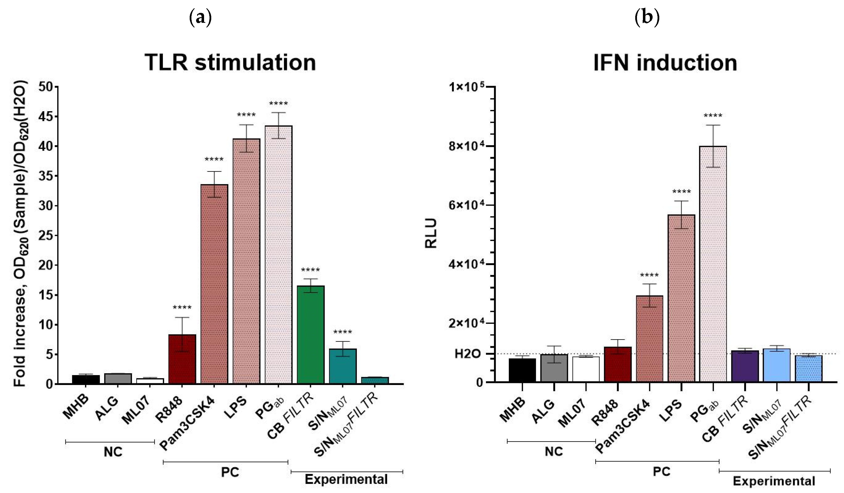 E. coli LPS induced NF-κB activity 43.5- and 41.3-fold and IFN pathway activation 8.2- and 5.8-fold above the negative control (water), respectively. The synthetic triacylated lipopeptide Pam3CSK4 increased NF-κB and IFN activity 8.4- and 3.0-fold, whereas R848, a TLR7/8 agonist, selectively triggered NF-κB activation (8.4-fold) (