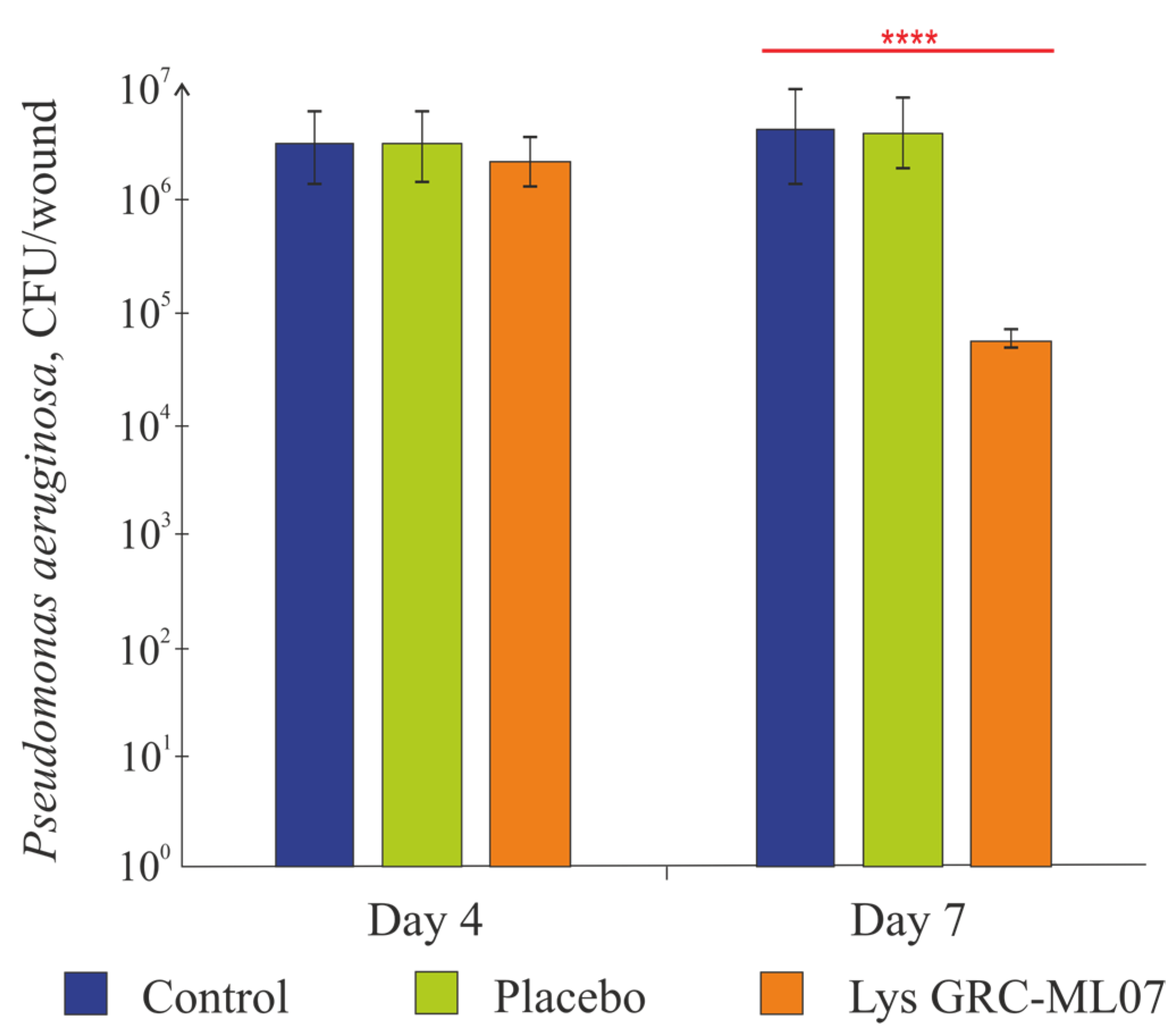 Figure 4), the alginate gel used as placebo did not affect bacterial load. While no statistically significant antibacterial effect was detected after four topical applications (day 4 post-infection), by day 7 (after 8 applications), bacterial counts in the GRC-ML07–treated group decreased by 2 log units compared to control or placebo groups (