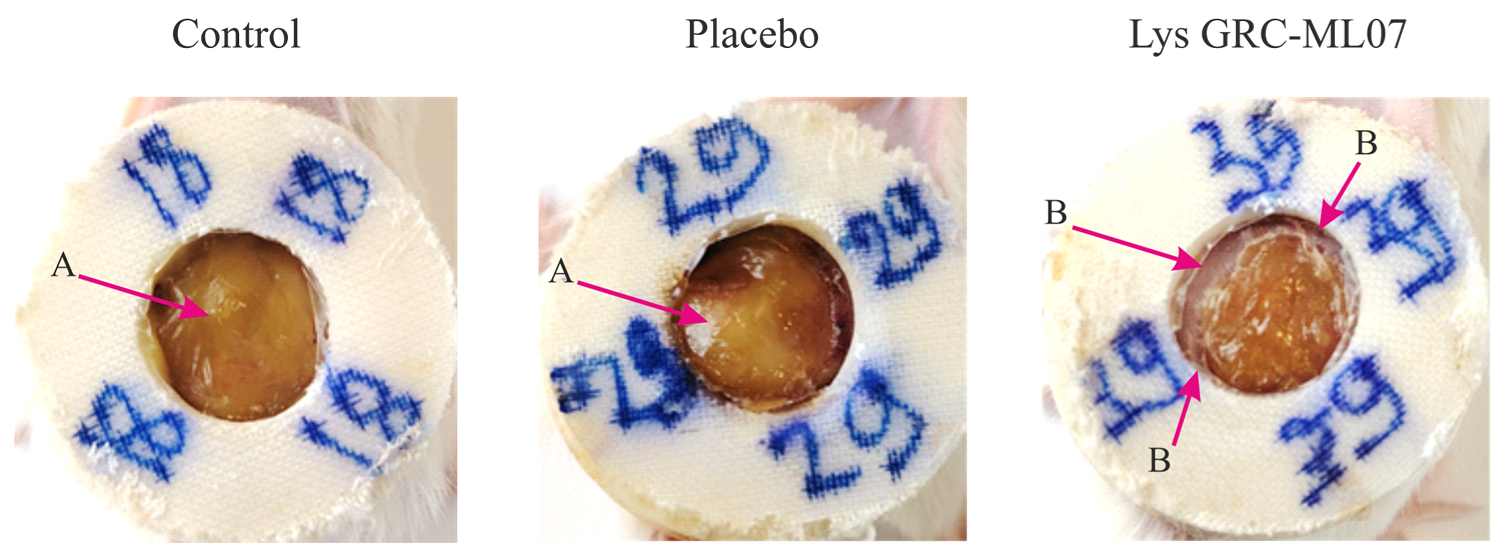Lysin—infected, treated with 100 µL of lysin GRC-ML07 (1 mg/mL in alginate gel).