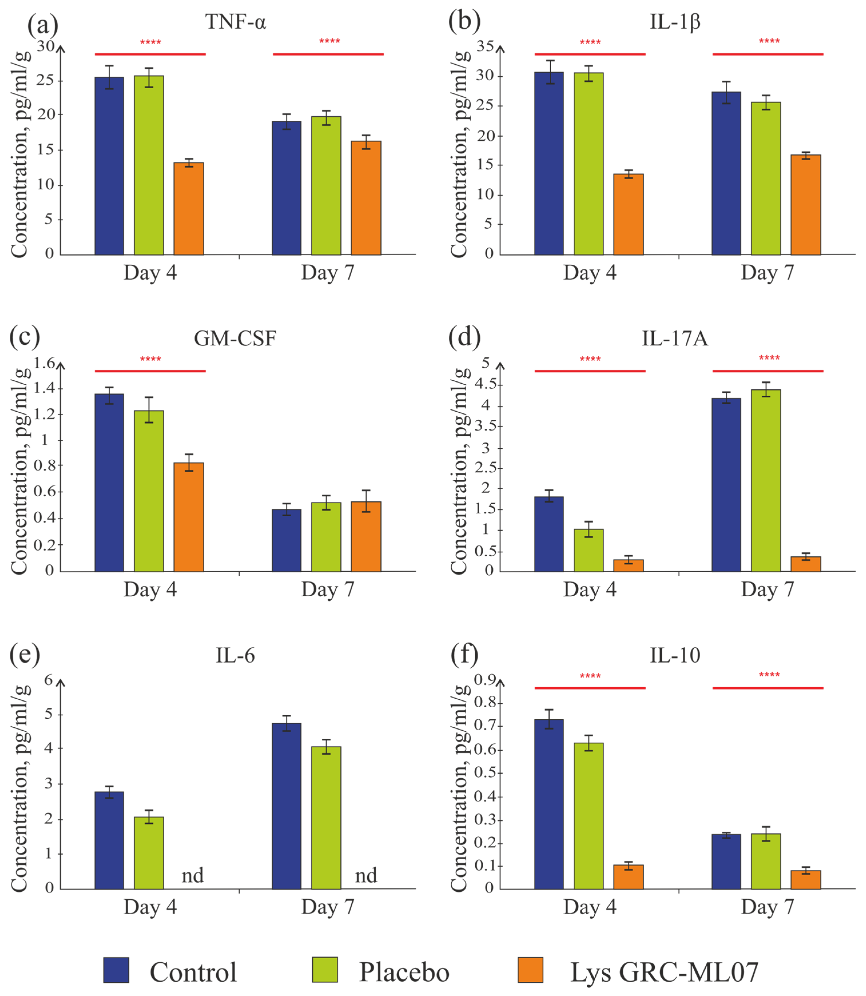 60]. These findings fully correspond to our data, where on day 4 of the experiment we observed a 1.9-fold decrease in TNF-α and a 2.3-fold decrease in IL-6 levels in the GRC-ML07 treatment group.