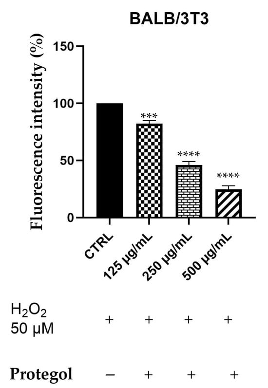 Intracellular ROS generation was assessed in BALB/3T3 cells exposed to 50 μM H2O2 and treated with Protegol at 125, 250, and 500 μg/mL using the DCFH-DA fluorescence assay. The BALB/3T3 murine fibroblast line was selected as a representative model for studying cytoprotective and antioxidant responses in non-tumorigenic cells. As reported for the previous assay, the same concentrations of Protegol were tested, and to ensure that they were not cytotoxic also in this cellular model, a preliminary MTT assay was performed, confirming that, also in this case, cell viability remained unaffected even at the maximum concentration tested (500 μg/mL), confirming the appropriateness of these doses for further assays. As depicted in Figure 3, Protegol treatment at 125 μg/mL lowered ROS levels to 82%, with a pronounced, dose-dependent decline to 45% and 24% observed at 250 μg/mL and 500 μg/mL, respectively.