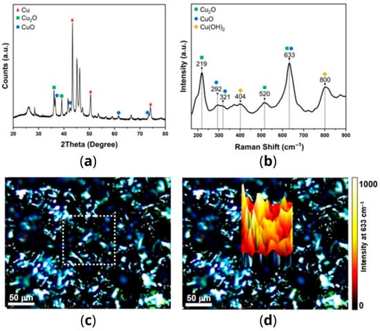 (a) XRD pattern of the copper-alloy tape; (b) Raman spectrum of the copper-alloy tape; (c) optical micrograph of the tape surface with the region designated for Raman mapping outlined by a dotted square; (d) 3D Raman intensity mapping obtained by monitoring the Cu2O/CuO band at 633 cm−1.
