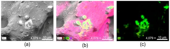 The morphology and elemental composition of copper-alloy tape were investigated using Scanning Electron Microscopy (SEM) coupled with Energy-Dispersive X-Ray Spectroscopy (EDX). The SEM image (Figure 2a) revealed a heterogeneous surface characterized by irregularities and roughness, features typically associated with polymer–metal composite coatings. Such micro- and nanoscale heterogeneity is relevant, as it increases the available contact area and may influence the interaction of the coating with microbial cells and environmental factors.