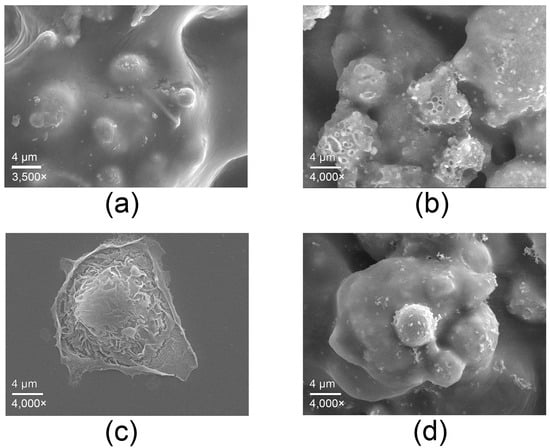 Keratinocytes in contact with the copper-alloy tape for 6 h (Figure 4d) adhered to the surface and exhibited a slightly retracted and rounded morphology compared to the control cell (Figure 4c), but maintained intact membranes and surface structures, with no evidence of physical damage. This behavior indicates moderate morphological adaptation to the metal surface, rather than cytotoxic effects.