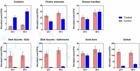 Statistics. Data normality was assessed using the Shapiro–Wilk test. Depending on data distribution, comparisons between treated and control groups were performed using either the independent-samples Student’s t-test or the nonparametric Mann–Whitney U test. Statistical significance was considered at p < 0.05 for all comparisons. The global variable, representing the mean microbial load across all surfaces, was also included in the analysis. Data were processed using the GraphPad Prism version 8.4.3 (GraphPad Software, San Diego, CA, USA) and results are presented as mean ± standard deviation or standard error of the mean.
