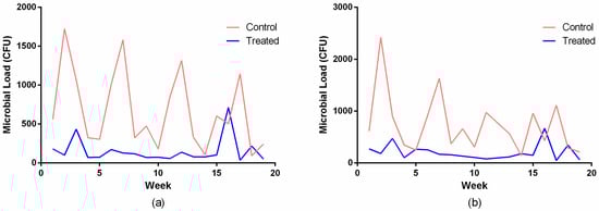 Figure 6 illustrates the temporal variation in global microbial load over a 19-week period. The control group exhibited high week-to-week variability, reflecting real-world variations in surface use, environmental conditions, and cleaning conditions in the hospital unit. Although fluctuations were observed across the study period, a consistent pattern emerged in which the surfaces treated with the copper-alloy tape maintained markedly lower microbial loads than the untreated controls. This pattern was observed at both incubation times, confirming that the observed differences were independent of culture duration. Investigations of copper surfaces in hospital environments have reported significant reductions in contamination with multidrug-resistant strains, correlating with decreased incidence of healthcare-associated infections [7,22].