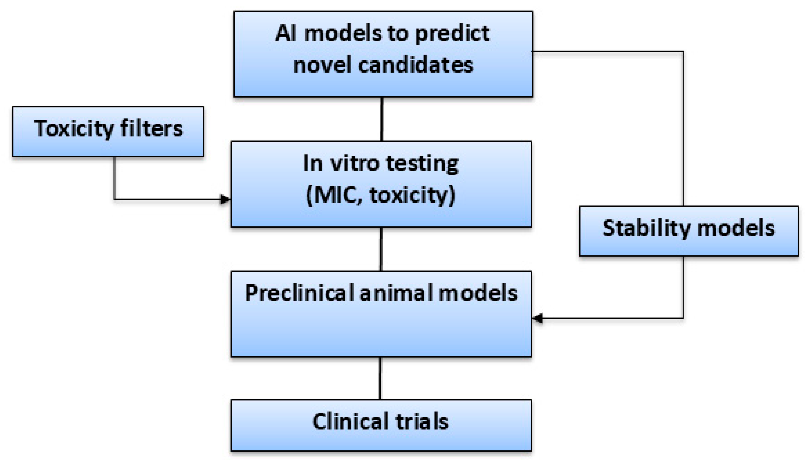 | Large Language Models | Species-specific peptide generation and MIC predictions. | Infers structural and functional constraints. | Requires higher computing. |