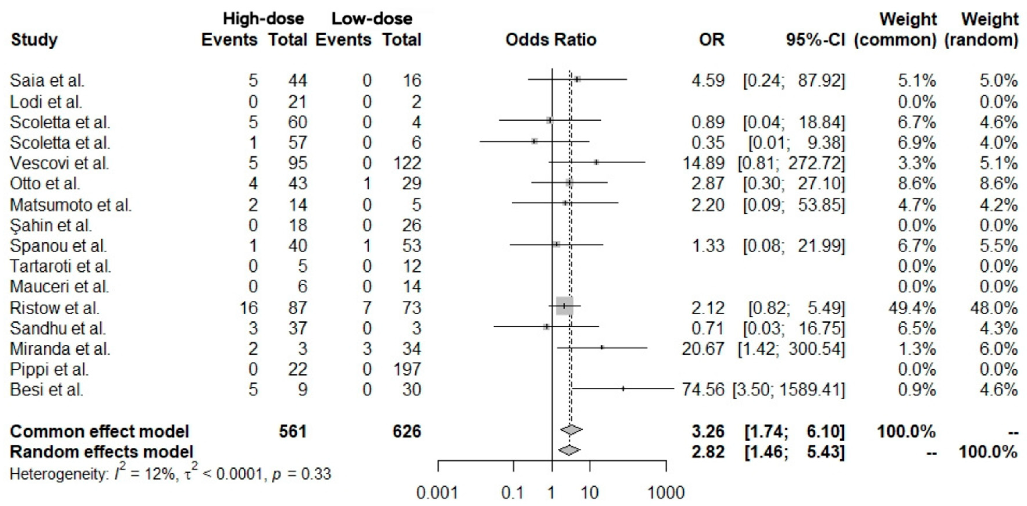 | High dose (vs. low dose) | +3.51 | 0.86 | +4.10 | <0.001 | 33.5 | 6.3–177.8 |