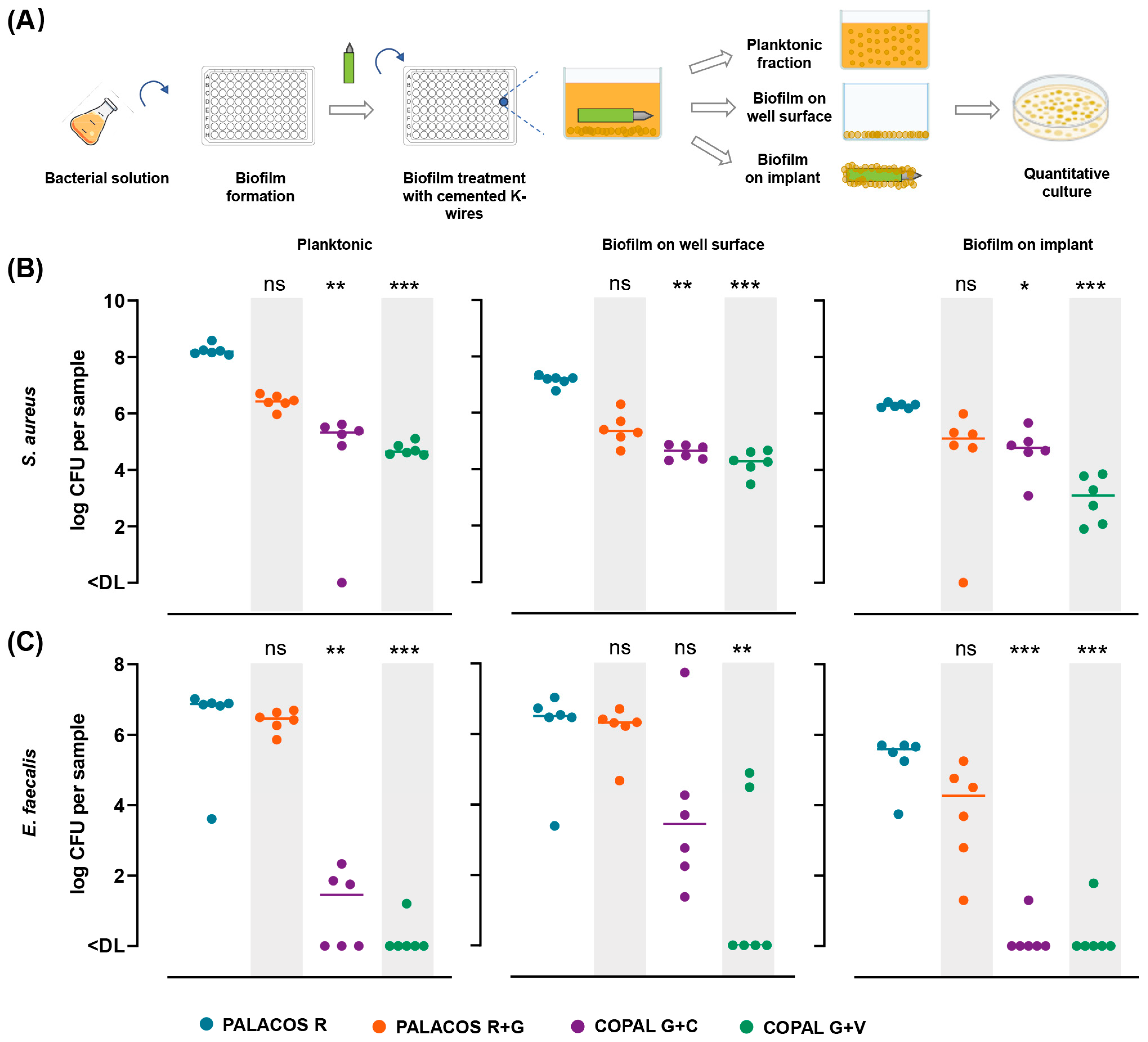 - Ensing, G.T.; van Horn, J.R.; van der Mei, H.C.; Busscher, H.J.; Neut, D. Copal Bone Cement Is More Effective in Preventing Biofilm Formation than Palacos R-G. Clin. Orthop. Relat. Res. 2008, 466, 1492–1498. [Google Scholar] [CrossRef]
