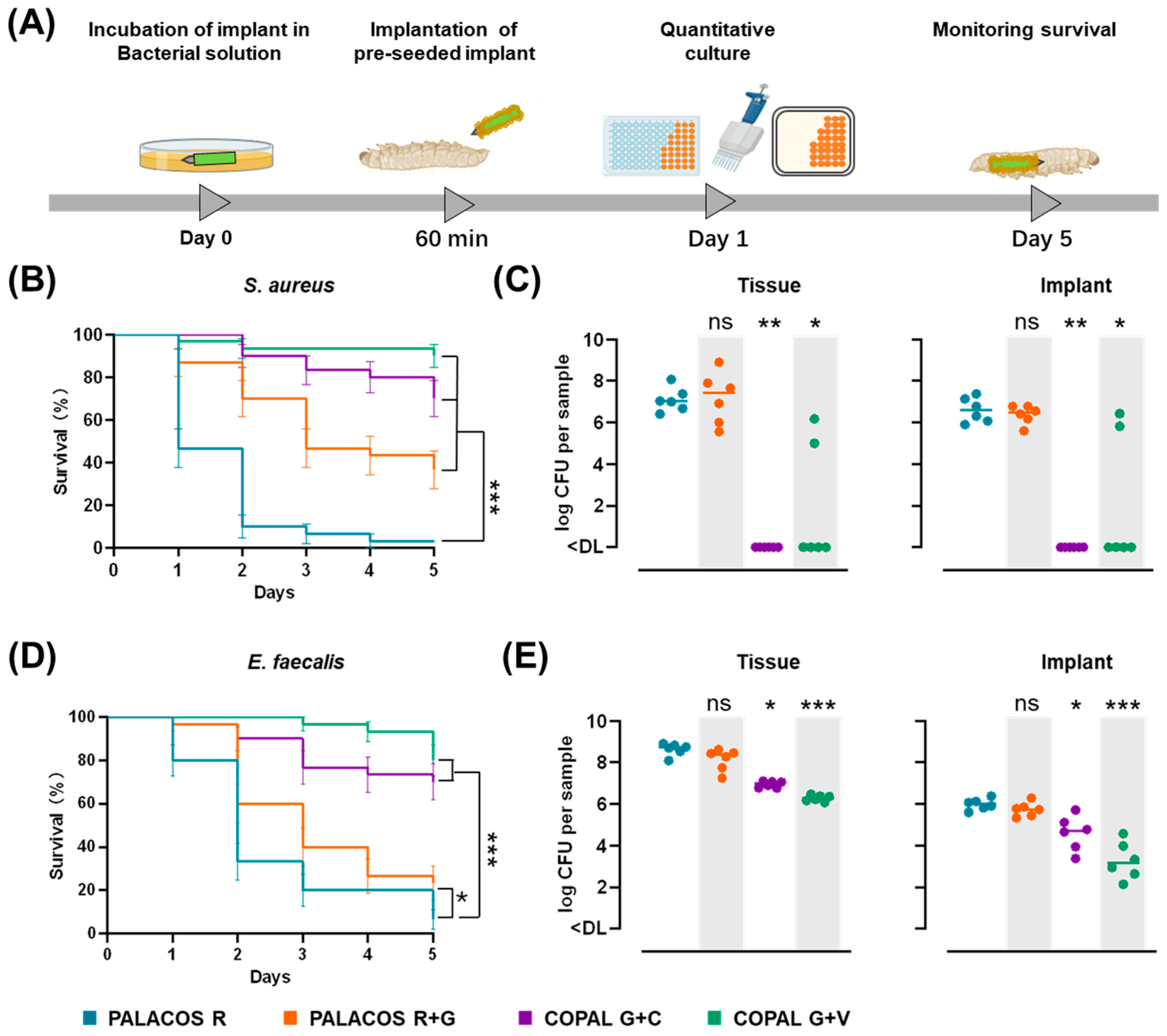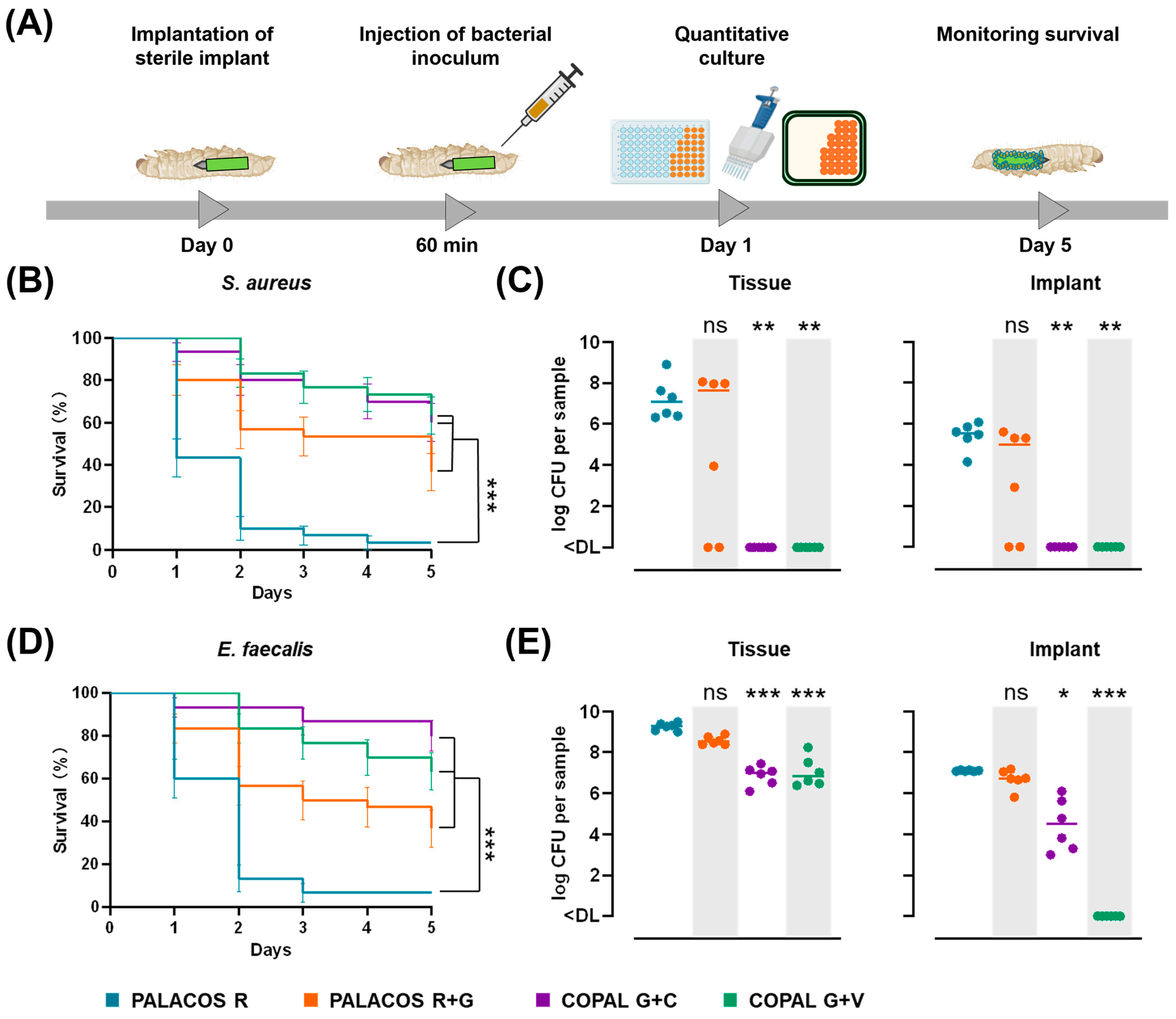 Zhao, Y.; Mannala, G.K.; Youf, R.; Humez, M.; Schewior, R.; Kühn, K.-D.; Alt, V.; Riool, M. Efficacy of Dual-Antibiotic-Loaded Bone Cement Against Multi-Drug-Resistant Staphylococcus aureus and Enterococcus faecalis in a Galleria mellonella Model of Periprosthetic Joint Infection. Antibiotics 2025, 14, 1280. https://doi.org/10.3390/antibiotics14121280