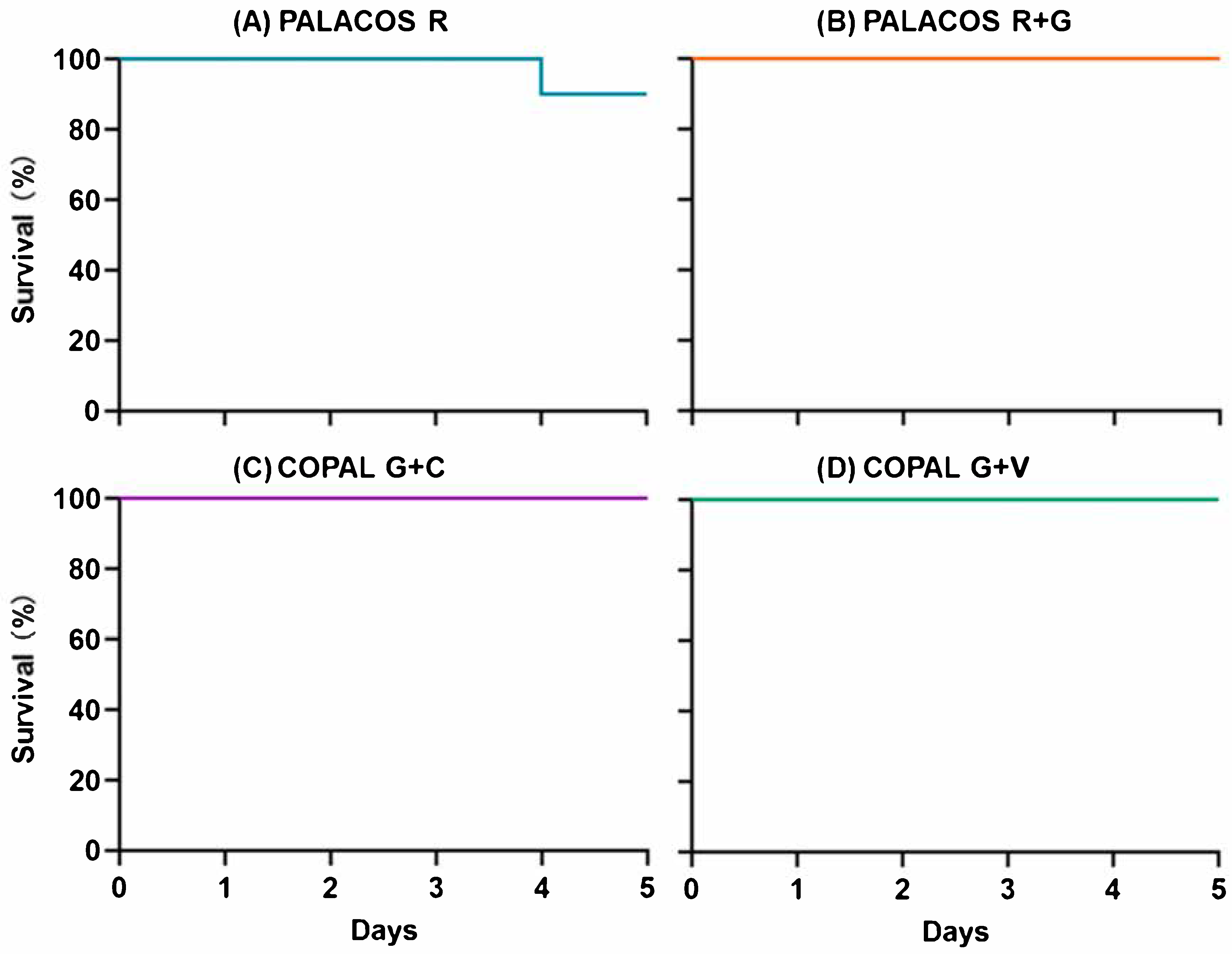 APA StyleZhao, Y., Mannala, G. K., Youf, R., Humez, M., Schewior, R., Kühn, K.-D., Alt, V., & Riool, M. (2025). Efficacy of Dual-Antibiotic-Loaded Bone Cement Against Multi-Drug-Resistant Staphylococcus aureus and Enterococcus faecalis in a Galleria mellonella Model of Periprosthetic Joint Infection. Antibiotics, 14(12), 1280. https://doi.org/10.3390/antibiotics14121280