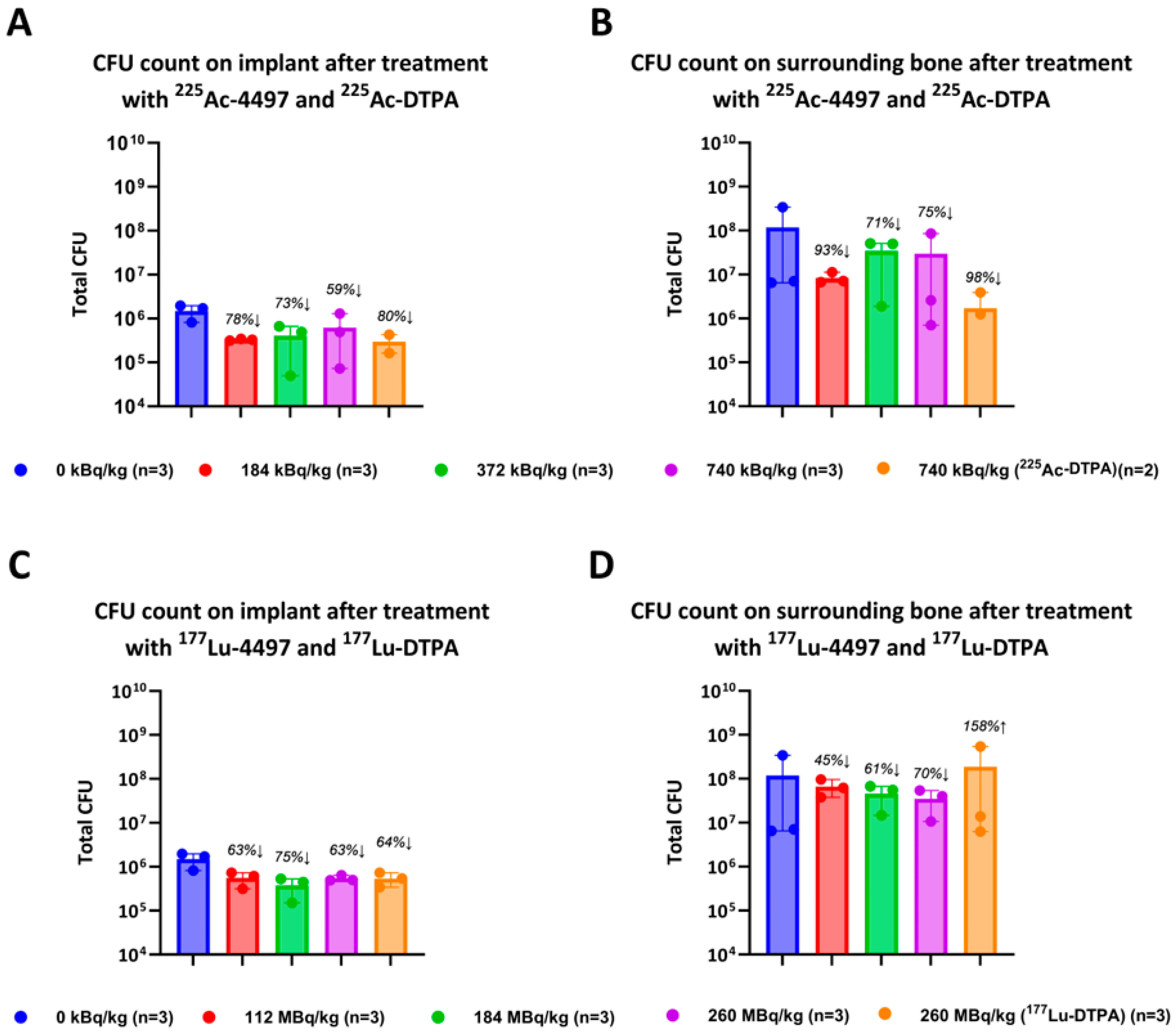 225Ac-4497 (740 kBq/kg) treatment group performed best of all RIT treatments with 78% and 93% CFU reduction on the implant and surrounding bone despite the accumulation shift and even under the challenge of low WBC count (