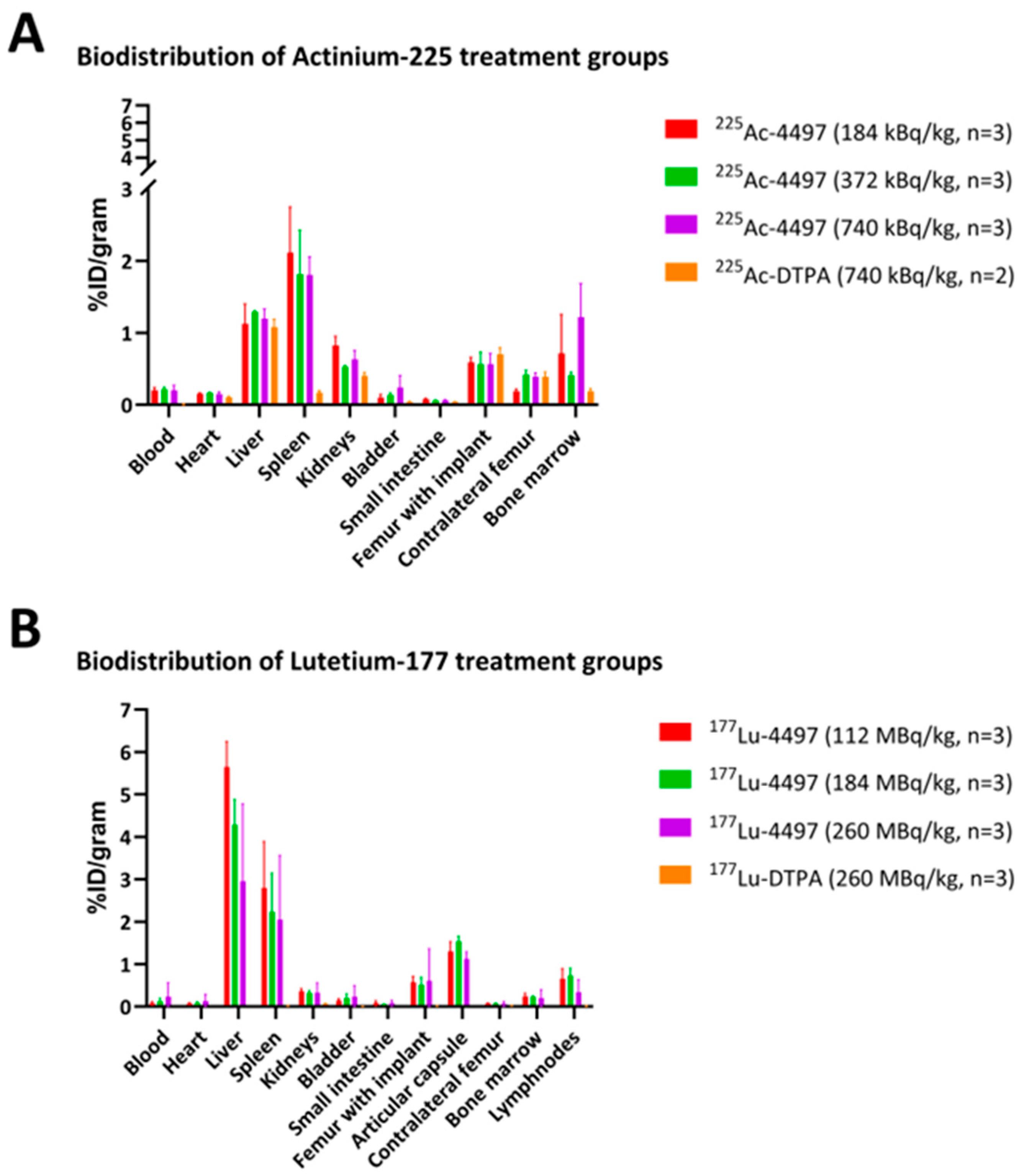 Figure 8). The hydrophilic DTPA was chosen over the more hydrophobic DOTA chelating molecule to reduce unwanted accumulation of the unbound Actinium-225 and Lutetium-177 ions. For the unbound radionuclide treatment groups, the administered radioactive dose was matched with the highest dose of the