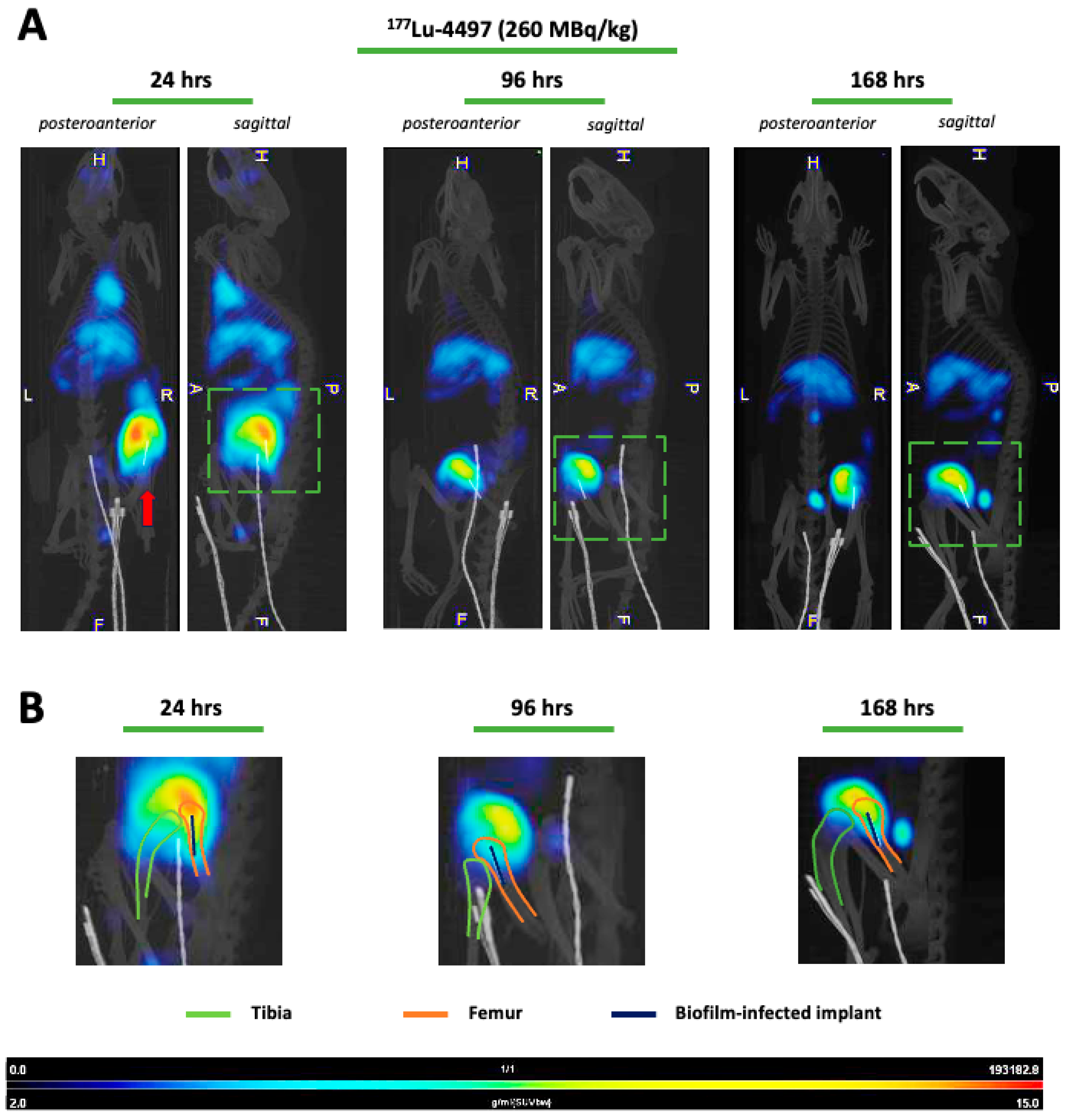 177Lu-4497) had a similar effect on the implant but almost no antimicrobial efficacy on the surrounding bone after the seven-day follow-up period. A significant observation in this study was the shift in RIT accumulation to the joint and articular capsule of the infected leg as a consequence of new infection onset in the joint (