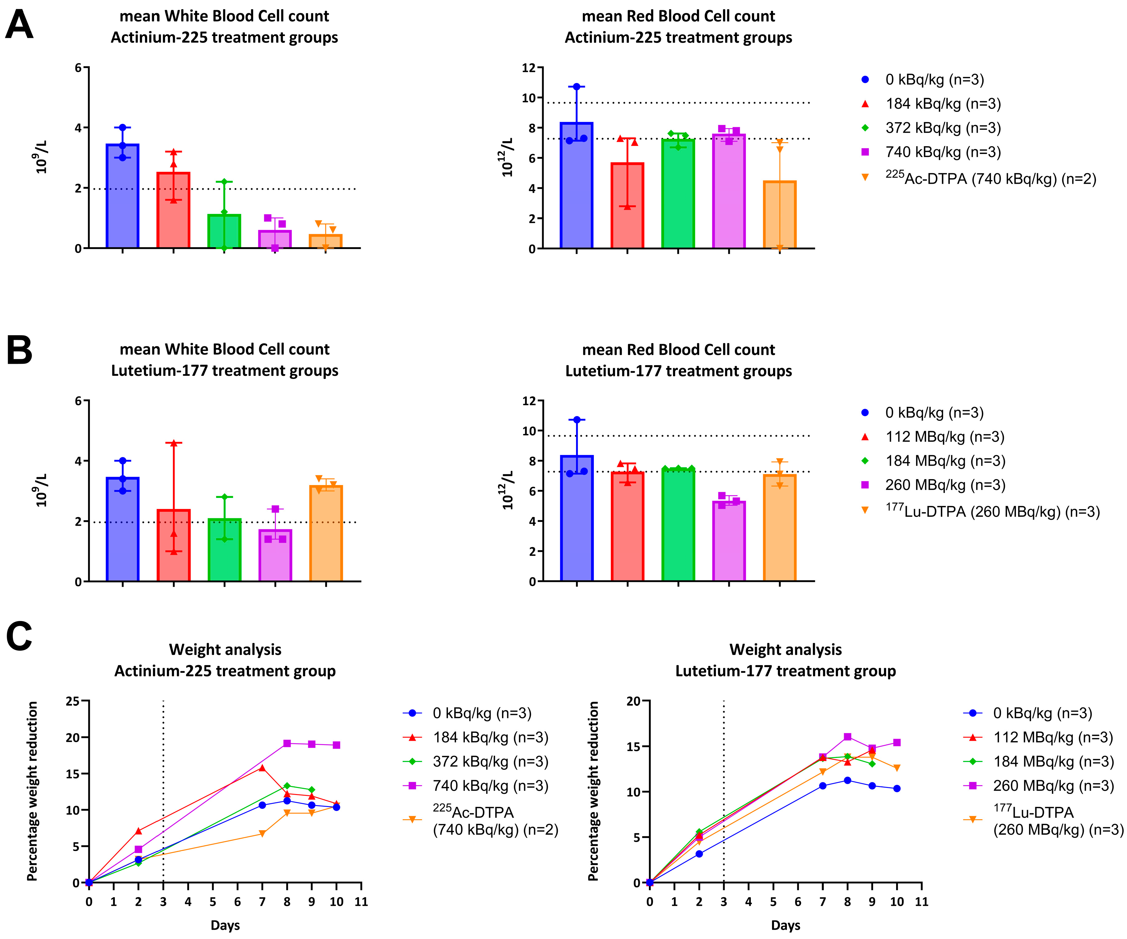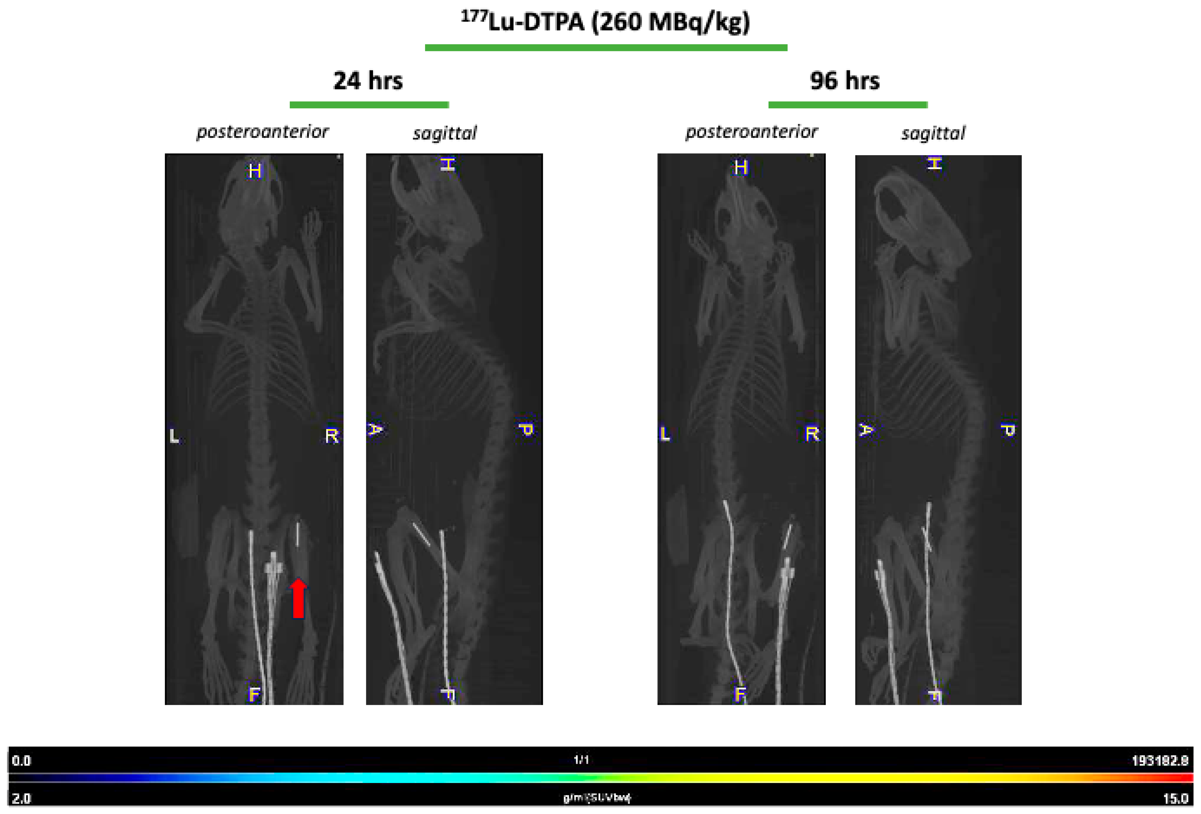In the Lutetium-177 study, twelve Wistar Han rats were treated with the 4497-antibody radiolabeled with Lutetium-177 (177Lu-4497). The doses per treatment group were 112 MBq/kg (n = 3), 184 MBq/kg (n = 3) and 260 MBq/kg (n = 3), respectively. Three rats received DTPA-bound Lutetium-177 (177Lu-DTPA treatment group) as an unbound radionuclide treatment with an activity of 260 MBq/kg (n = 3). Additionally, three rats were treated with saline, serving as a control group (0 kBq/kg).